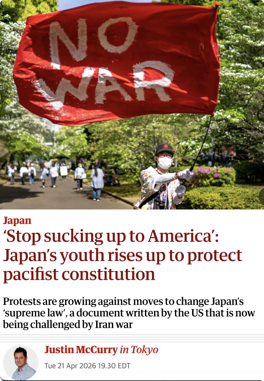 英媒:日本年轻人掀起抗议浪潮,反对政府修改由美国起草、已实施80年的和平宪法,尤其是放弃战争权的第九条。 导火索是美国求日本派海上自卫队参与伊朗战争,首相高市早苗领导的自民党在2月选举中获得三分之二超级多数后力推修宪,并于本周取消致命武器出口禁令。 抗议规模从2月的3600人激增至4月19日的3.6万人,30岁群体占比最高,女性占六成,参与者挥舞光剑和"猫咪不要炸弹"等标语,呼吁政府"停止讨好美国",担忧修宪将使日本卷入海外战争,而高市早苗则视第九条为战败耻辱,欲借修宪让日本成为"正常国家"。