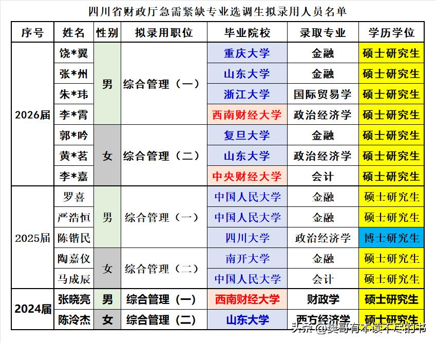 四川省财政厅2026届急需紧缺专业选调录用7人,这次录用的人数算是这些年来最多的了,已经是2024和2025届录用人数的总和了。和此前一样,大量985大学的财经相关专业和四大顶级财经专业院校的毕业生构成了最终的录用名单。西财作为四川省内院校,又是央行直属院校,肯定会占据一席之地。财政厅是不错的单位,选调质量肯定也很高,录用名单也能反映出。