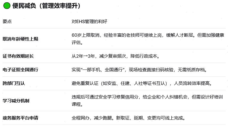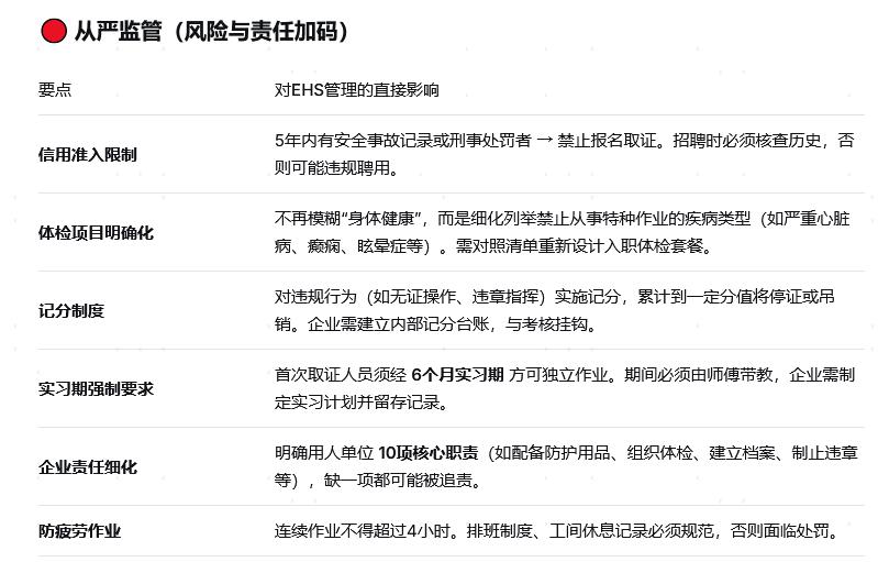 取消60岁年龄上限!但新增5年信用黑名单——新规下的EHS生存指南 1. 制度更新(最迟2026年4月前完成) 修订 《特种作业人员管理制度》,加入:信用准入核查流程、体检疾病负面清单、6个月实习期管理规定、连续作业≤4小时的排班规则、记分与学习减分细则。 制定 《特种作业实习期带教手册》 及 《实习考核表》,明确师傅资质和考核标准。 2. 人员档案重构 建立 “一人一档”,包含: 信用查询记录(公安/住建系统截图) 体检报告(对照新规疾病清单逐项打钩) 电子证照截图(全国通用二维码) 记分台账(违规时间、分值、学习修复记录) 对于超60岁人员:取消年龄限制后,必须每半年提供一次专项体检证明(重点心脑血管、反应能力)。 3. 现场管控强化 防疲劳作业:改造排班系统,设置连续作业满4小时强制休息提醒(如电子工牌或班组长喊停)。休息时间≥30分钟。 实习期管理:实习人员安全帽/反光衣加贴 “实习”标识,严禁独立操作高危设备(如塔吊、施工升降机)。 记分落地:在项目现场公示记分规则,对常见违章(不戴安全带、无证操作)直接扣分并挂钩月度安全奖。 4. 培训与考试设计 利用 “学习减分”机制:内部开发或接入官方平台的安全课程,让违章人员通过学时修复信用,同时保留培训记录作为合规证据。 针对体检疾病清单:组织一次全员复检(尤其心脏、血压、神经系统),对不合格者调岗或劝退。 5. 跨部门协同 主动联系当地住建部门,明确 电子证照查验方式,更新公司入场验证系统(支持扫码)。 与人力资源部联动,在招聘JD中加入“无5年内安全事故/刑事处罚记录”承诺条款,并背调。