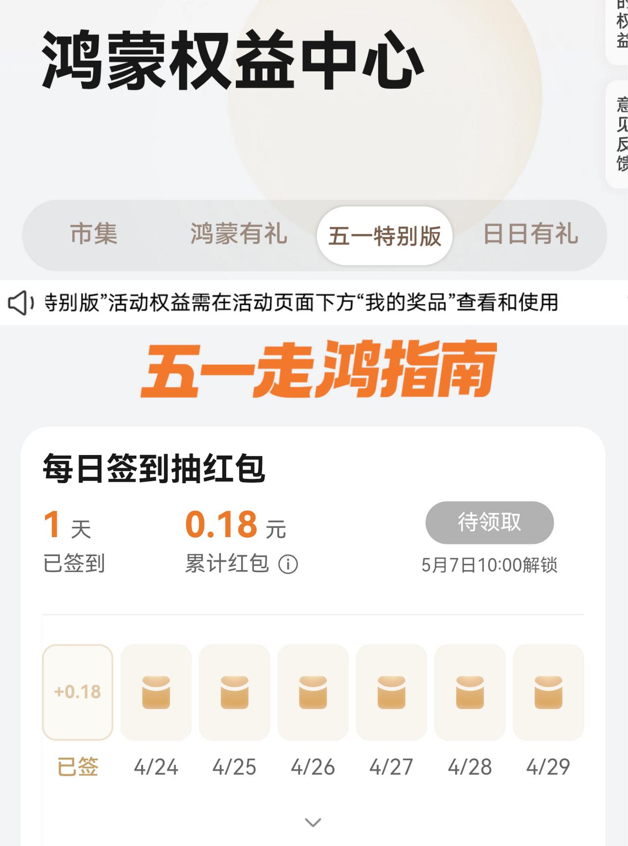 大家快去领红包。华为的鸿蒙有礼推出了五一特别版,每天都可以领红包。