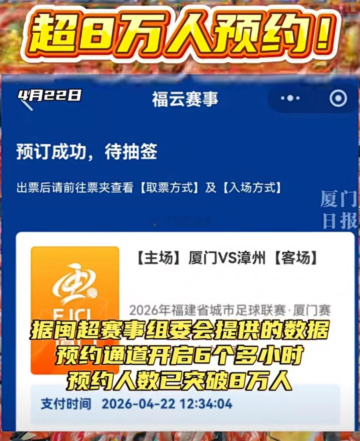 闽超厦门主场预约人数已突破8万人