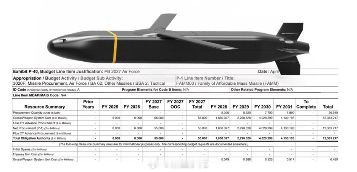 美国空军计划在未来五年发展计划(FYDP) 期间,总计采购 27910 枚 FAMM‑P/L 系列巡航导弹。🔸2027 财年:1000 枚全备弹🔸2028 财年:5300 枚全备弹🔸2029 财年:5920 枚全备弹🔸2030 财年:7700 枚全备弹🔸2031 财年:7990 枚全备弹