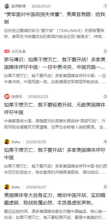 如果不想灭亡,就不要开战!多家美国媒体呼吁中国:一旦中美冲突,中国死路一条。此前美国空军高层早就放话,中国会输得很惨。多家美国媒体齐声附和,警告北京别轻举妄动,否则国家将会“毁灭”...... 麻烦看官老爷们右上角点击一下“关注”,既方便您进行讨论和分享,又能给您带来不一样的参与感,感谢您的支持! 其实这套路早就不新鲜了。人民日报早在2023年就点破过:先有政客放风,再有智库起哄,最后媒体跟着炒,把“中美必有一战”包装得跟真的似的。当年的美国空军上将米尼汉就是代表人物,2023年他在内部备忘录里直接喊出“2025年跟中国决战”,闹得全世界都知道。结果呢?2024年底他被迫“提前退休”了。有意思的是,2026年初他接受美国《战区》网站专访时,语气完全变了,承认美军最大的问题是“资源、资源、还是资源”,空运能力跟不上,想往亚太大规模投送力量“根本没法迅速投入实战”。一个以前天天喊决战的人,退休后说了实话,这背后的事实比任何叫嚣都更能说明问题。 美国媒体不是单纯喊口号,他们最爱引用的,是兰德公司和战略与国际研究中心那些智库报告。但仔细一看,这些报告的前提条件太偏心了:美军可以无限制使用盟友基地,可以先发制人打击中国指挥链,台湾地区防务力量还得能拖延足够长时间。即使在这些最有利于美方的假设下,报告也承认美军损失会非常大,航母群可能被重创,全球经济跟着遭殃。更别提战略与国际研究中心那22轮兵棋推演里,居然假设美军能用2200枚AGM-158C反舰导弹,可实际上美军的库存才400多枚,每年只能生产几十枚。拿游戏数据当军事推演,这不叫分析,这叫自己给自己壮胆。 所以问题来了:既然打起来自己也要掉层皮,美国还一个劲儿往台海凑什么呢?看看今年1月16日至17日,美国“菲恩”号导弹驱逐舰和“西尔斯”号海洋测量船大摇大摆穿越台湾海峡,解放军东部战区全程跟监警戒。这已经是特朗普上任后美军舰第四次过航台海了。军售这边更夸张,4月22日台“国防部”刚跟美方签了6项军购案发价书,总金额2087亿元新台币。据岛内媒体报道,后续还有可能推出更大规模的军售方案。一边把军舰开到别人家门口,一边把武器卖给一个中国省份,转过头来说“我们奉劝中国保持克制”——这不就是标准的贼喊捉贼吗? 说白了,美国媒体的这套恐吓战术,很大程度上是为了内部政治需要。增加国防预算、拉拢盟友、推动对华技术封锁,都需要制造一种“中国威胁巨大但又可以被击败”的叙事。美国2026财年国防授权法案已经把军费推到9010亿美元,特朗普还放出话要把2027财年军费进一步抬到1.5万亿美元。军工复合体要赚钱,国会需要理由,媒体就得负责造势。新华社早前就援引美国参议员桑德斯的说法指出,美国的国防体系已经成了少数大型承包商牟利的工具。把战争叙事当生意来做,这才是最讽刺的地方。 可问题是,美国自己真的打得起吗?2026年2月美以伊战事爆发后,美军对伊朗空袭用了超过1000枚JASSM导弹,单价150万美元,可洛马公司2026年全年最多只能产860枚。战斧巡航导弹也打了至少850枚,比2003年伊拉克自由行动的802枚还多。这才是打伊朗,换成中国,消耗量至少要翻几十倍,美军弹药库能撑几天?连前美国空军部长弗兰克·肯德尔都承认,太平洋战区里,美军的F-22、F-35面对解放军的远程精确打击,可能连地面都飞不起来。哈德逊研究所2025年1月的报告更直白:要是跟中国大陆冲突,绝大多数美军飞机得折在机场地面上,损失可能是毁灭性的。打仗靠的是弹药、是补给、是体系,不是靠喊口号。 经济账就更不用算了。美国联邦政府债务已经突破36万亿美元,通胀压力在能源冲击下再度抬头,穆迪早已下调了美国主权信用评级。打仗要钱,而且要的不是小钱。一场对中国的战争,军费开支会让美国财政彻底崩盘,谁更输不起一目了然。相比之下,中国的国防支出占GDP比重长期低于1.5%,坚持防御性国防政策,走的完全是不同的路数。不是因为我们没有能力扩军,而是因为我们清楚,发展比打仗划算一万倍。 再看看军事层面。第一岛链内,中国的高超音速导弹和区域拒止体系已经非常成熟。东风-17高超音速导弹速度快、弹道怪,美军到现在都没有实战可用的拦截手段。东风-26导弹4000公里射程能覆盖关岛,055型驱逐舰112个垂直发射单元的火力密度远超美军伯克级。美军在台湾海峡1000英里范围内,加固机库和非加固掩体只增加了43座,而同期中国增加了超过3000座——差距两百倍。这意味着什么?意味着美军在亚太的空军基地,在第一波打击中很可能就被瘫痪。在这种不对称优势面前,美军那些纸面数据再好看,也扛不住实战检验。