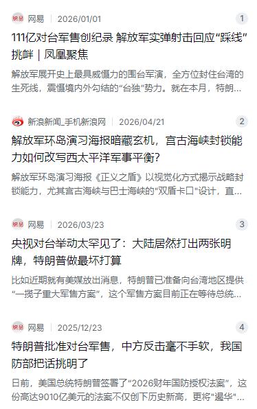就在特朗普批准出售武器装备给台湾后,中国首次以“武力”威慑美国,中国公开表态:解放军将采取有力措施捍卫国家主权领土,美国批准这项创纪录对台军售时,谁也没想到后续来得这么快。 麻烦看官老爷们右上角点击一下“关注”,既方便您进行讨论和分享,又能给您带来不一样的参与感,感谢您的支持! 这件事还得从2025年12月说起。那时候特朗普刚赢了大选没多久,正在准备交接,结果他手头上一份“2026财年国防授权法案”就直接签了字。这份法案总额高达9010亿美元,里头塞了111亿美元的对台军售项目。对,你没看错,111亿,这不是小打小闹,是实打实的创纪录大单。 美国国防部安全合作局2025年12月17日正式公布了军售清单,整整8个项目,包括海马斯远程精准打击系统、M109A7自行火炮、反装甲型无人机导弹系统、标枪反坦克导弹、TOW导弹、AH-1W直升机零附件,还有鱼叉导弹修复套件检修等等。这还没完,法案里还专门编了10亿美元搞“台湾安全合作倡议”,说白了就是要给台军搞实战化训练。装备是旧的——什么AH-1W型直升机的零件、快过时的鱼叉导弹检修套件,明摆着就是清库存——但政治挑衅的意味一点没打折扣。 这批军售规模大到什么程度呢?这么说吧,奥巴马政府8年对台军售加起来大概140亿美元,拜登政府4年加起来84亿美元,而特朗普这一单就111亿美元,直接打破了1992年老布什政府卖150架F-16给台湾那次60亿美元的历史纪录。 特朗普这操作,说到底还是投机。一边在媒体上说着想跟中国搞好关系、计划访华,一边手底下疯狂踩红线。说白了,这既是讨好国内军工集团的大生意,也是在国际上持续打“台湾牌”的政治表演。可问题是,这碗“投机饭”,中国不是不买单,而是从来就没打算按他的剧本演。 2025年12月18日,也就是军售公布后的第二天,中方宣布对美国进口的三元乙丙橡胶发起反倾销期终复审调查。同时,还取消了13.2万吨美国白小麦订单。经济牌打完,金融牌跟上——中国大陆连续减持了118亿美元美国国债,持仓总规模降到6887亿美元,这是2008年以来的最低值。你不是拿台湾老百姓的钱养军火商吗?那就让你看看,谁更疼。 但真正让外界紧张的,不是这些经济反制,而是中国国防部的那番表态。12月19日,国防部新闻发言人直接挑明了三句话:第一,美方对台军售严重违反一个中国原则,严重损害中国主权和安全利益;第二,“台独”势力用老百姓的血汗钱买武器,妄图“以武谋独”,最终只能是飞蛾扑火、自取灭亡;第三,中国人民解放军将持续加强练兵备战,采取有力措施捍卫国家主权和领土完整。 这里有个细节值得注意:以往中方表态更多的是强调“强烈不满”和“坚决反对”,而这次直接把“采取有力措施”摆到了桌面上。在涉及台湾问题的官方表述中,“有力措施”四个字的含义非常明确——不排除任何选项,不承诺放弃使用武力。 就在国防部表态后不到两周,2025年12月29日,中国人民解放军东部战区突然无预警宣布启动代号为“正义使命-2025”的围岛实兵演习。注意,是“无预警”——没有提前通知,没有外交照会,直接开演。这种不打招呼的方式,本身就是一种强烈的信号传递。 12月30日,也就是演习的第二天,东部战区陆军部队协同海军、空军、火箭军等兵力,对台岛南部相关海域实施了远程联合火力突击和实弹射击。同一天,驱护舰和歼轰机编队在台岛南北两端开展了查证识别、警告驱离等科目演练。 最让人震撼的是,侦察无人机传回了俯瞰台北101大楼的高清影像。画面配上“这么近那么美,随时到台北”的字样,直白到不能再直白。这哪是演习,分明就是在说:我们随时能到,你想好后果没有? 面对解放军这一连串实打实的动作,西方媒体的反应可以说是既在意料之中又让人无语。他们不去追问美国为什么要卖武器给一个中国省份,不去追问特朗普政府为什么一边说要跟中国搞好关系一边踩红线,而是直接把解放军的正当维权行动贴上了“军事威胁”的标签。 这种双重标准已经不是第一次了。美国媒体和智库长期以来就有意无意地把台海问题从“中国内政”扭转为“区域安全危机”,通过渲染紧张气氛来为军售和军事存在找借口。说白了,美国自己不断加码对台军售是在“维护和平”,中国在自己家门口搞演习就是在“破坏稳定”——这种话术,但凡有点常识的人都看得出有多荒谬。 更荒唐的是,特朗普政府自己的立场也在左右横跳。2025年12月刚批了111亿美元大单,到了2026年2月,眼看要访华了,又传出消息说准备推迟宣布新的对台军售计划,理由是“避免在访华前激怒中国”。特朗普本人也在媒体上改口,说什么“正在考虑如何处理这个问题”,还表示台湾问题是“中国自己的事”。这种反复无常的操作,说到底就是拿台湾当筹码、当棋子——用得着的时候拼命武装,用不着的时候随手一扔。