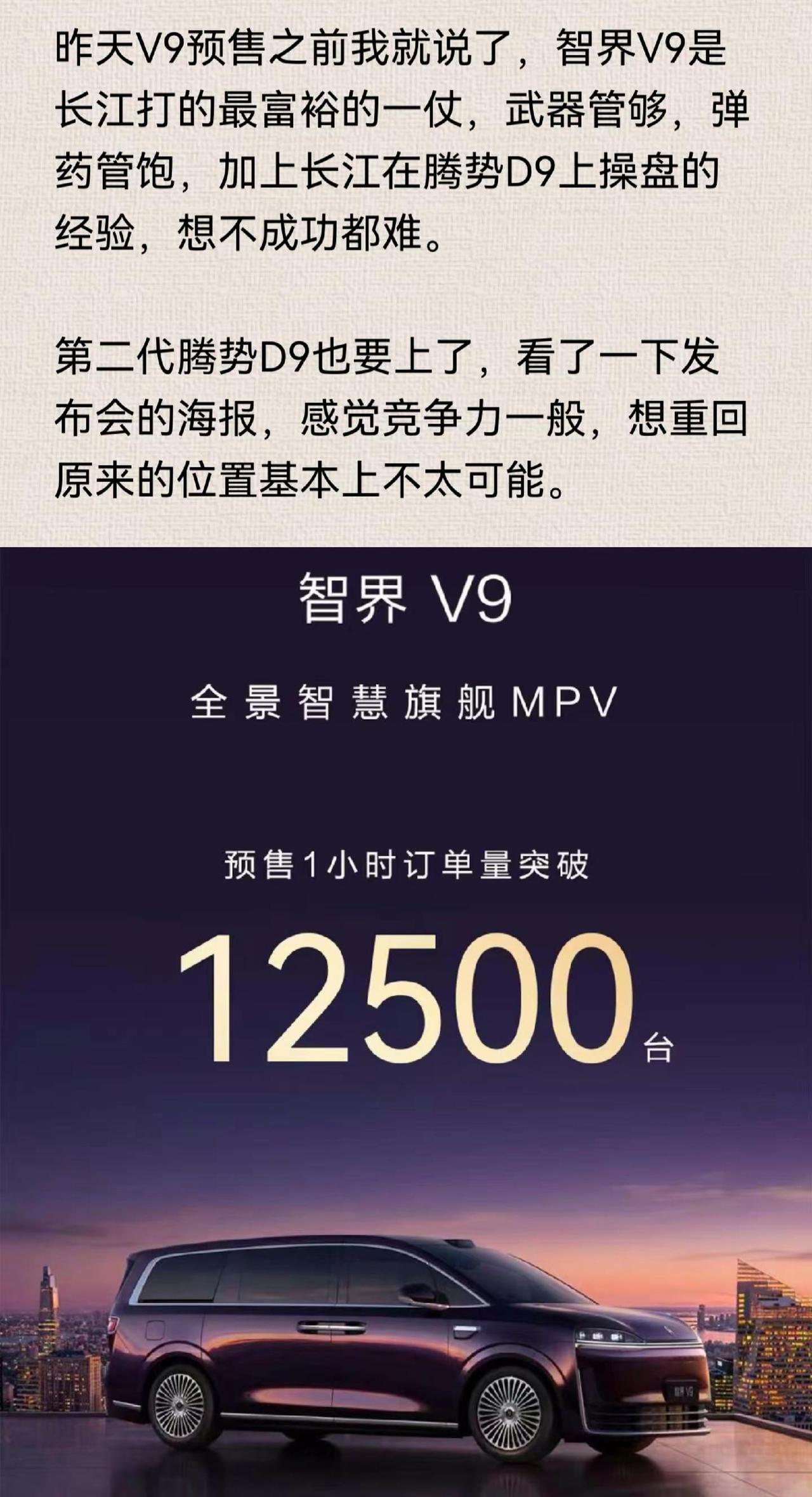 昨天V9预售之前我就说了,智界V9是长江打的最富裕的一仗,武器管够,弹药管饱,加上长江在腾势D9上操盘的经验,想不成功都难。第二代腾势D9也要上了,看了一下发布会的海报,感觉竞争力一般,想重回原来的位置基本上不太可能。智界V9