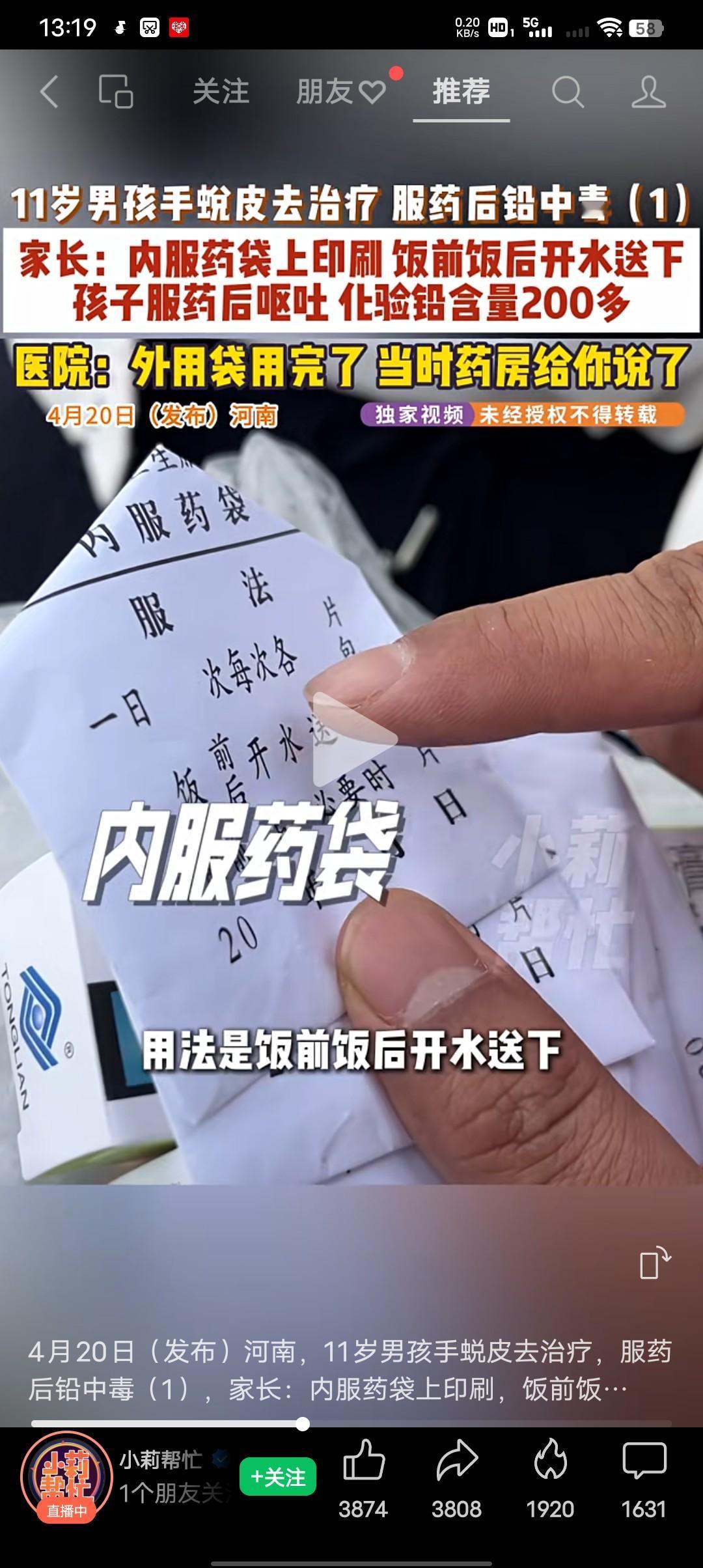 十一岁男孩手脱皮服药后铅中毒,到底是院方的责任,还是监护人责任更重一些? 十一岁男孩手脱皮去医院皮肤科去看手,医生给开了药写了一个方案,一种是药膏,一种是六包粉末状的袋装药,当时药房的人什么也没说,是内服的药袋,饭前还是饭后开水送下,冲了一包给孩子喝下去了,刚喝下去,没一会儿孩子就呕吐,我们就赶紧给孩子往县医院送,那边赶紧给洗胃。抽血检查铅含量200多了,正常是低于100,结果检查报告是铅中毒。 孩子爸爸:为啥要把这么毒的药给他装到内服药的袋子里? 医生:治皮肤用的药是现配的,外用药的袋子用完了,但是你拿药的时候我也跟你说了。 这下好了,就算医生真的说了,但是你没有证据啊,你做的还是不够严谨,就算外用的药袋子用完了,你可以把上面写的字划掉,然后又比重新标记一下不就行了吗?这下好了,医生要担责任了吧?