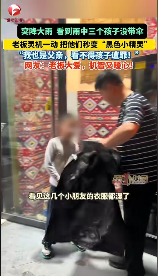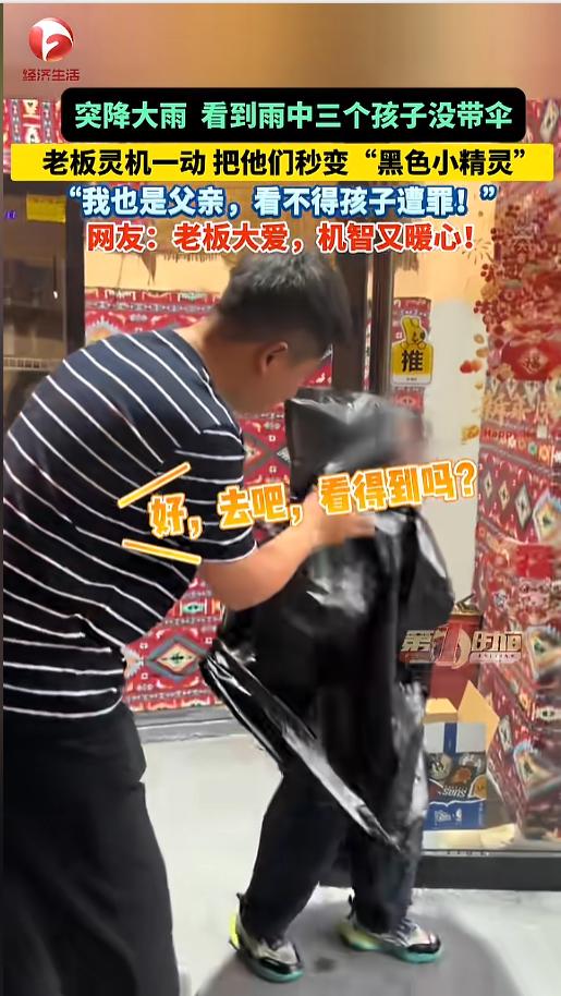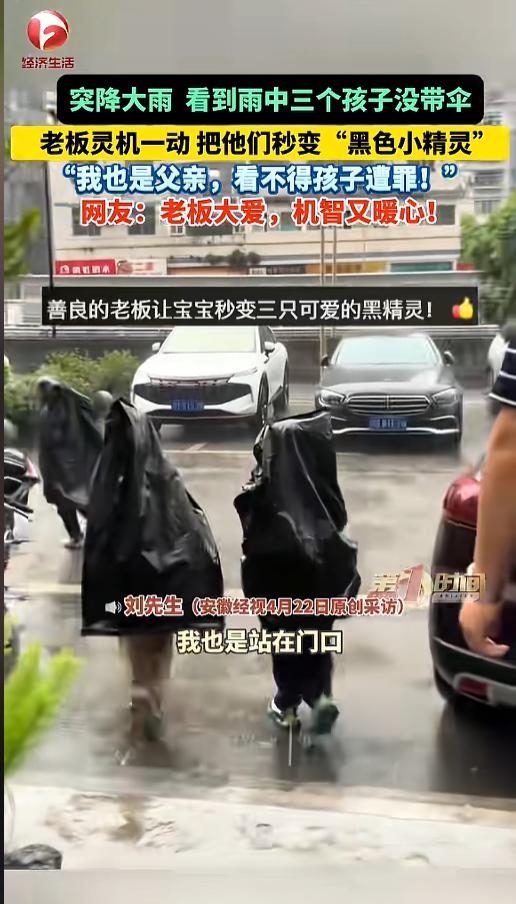 “这办法不错!”近日,四川巴中,天空突然下起了大雨,一酒馆老板发现雨中有三个没带伞的孩子,就赶紧让他们来店里避雨。他看见孩子都湿透了急需要回家,可自己又没开车,没办法送,店里伞也不够。灵机一动,他找出了垃圾袋! 据媒体4月22日报道,事发当天,刘先生正在自家的小酒馆坐着,没想到突然就变天了,下起了瓢泼大雨。这时候,他透过门瞅见,有三个孩子没打伞,在雨里面淋着。 他噌的一下就站起来了,赶紧跑到门口,让孩子进来躲躲雨。等进来一看,孩子的衣服都湿的差不多了,自己店里也没办法给烘干。孩子本来是在回家的路上,被这一场雨淋了个措手不及。 刘先生也想明白了,孩子得抓紧回家换衣服,而且孩子家长肯定也在着急,待在他店里也不是个事儿。可是自己今天又没开车,没办法给送回去。他在店里找了半天,也没有那么多伞。 这时候,他灵机一动,想到了店里的大垃圾袋。这垃圾袋很结实,也防水,关键是还能把孩子给罩起来,当雨衣最合适不过了。他马上行动起来,让孩子乖乖站好,给套上了袋子,然后在脸的位置给掏了个洞,这样既不会被淋着,也方便观察。 他又仔仔细细的调整了一遍,保证每个孩子都被罩的严实,也检查了下,确保孩子不会踩到袋子,没有摔跤的隐患。这一切搞定后,才让孩子出了门。三个孩子蹦蹦跳跳,就像黑色的精灵一样! 网友看到后,纷纷怀念起了自己的童年,小时候拿袋子当过雨衣,透明薄膜,尿素袋,好几种都用过,那时候,感觉真快乐啊! 信息来源:《突降大雨,看到雨中三个孩子没带伞,店里又没那么多伞,于是老板灵机一动 把他们秒变“黑色小精灵”!“我也是父亲,看不得孩子遭罪!” 网友:老板