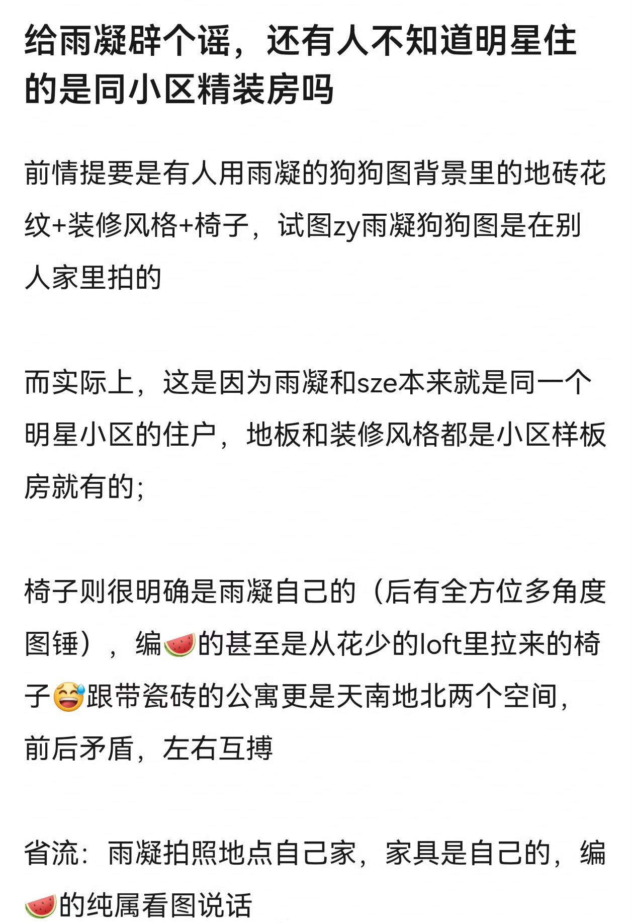 所谓的锤来锤去不还是在拿一些捕风捉影的东西硬摁头??椅子也就沾个款式类似的边,细节也根本对不上,宋祖儿小号被扒都能一步步发散成这样,这跟好好走在路上平白无故被踹一脚有什么区别、、、曝刘宇宁宋祖儿同款地板家具