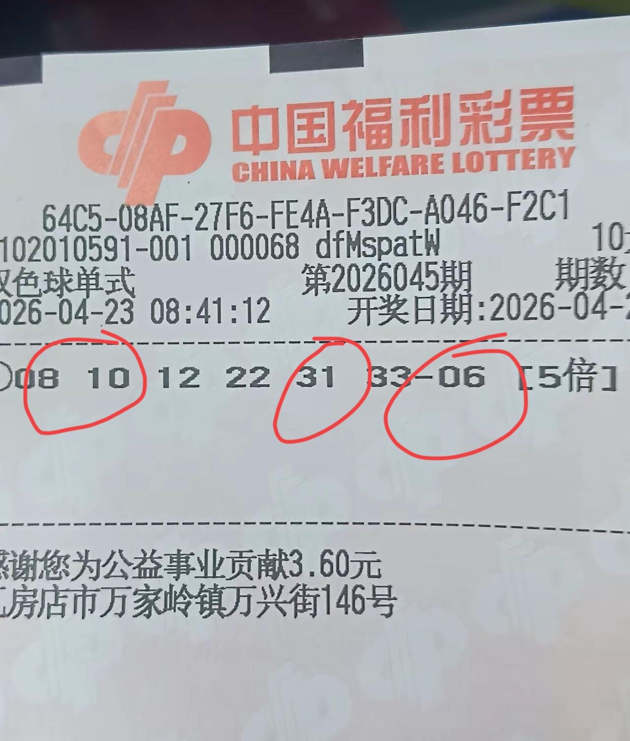 严重撞号。来自辽宁的彩友想法都一样,一张是辽宁盘锦,另一张是辽宁瓦房店,撞了不止一个号,实在是有趣!莫非,08-10-31,还有后区06都是辽宁彩友的最爱吗?[偷笑][偷笑]