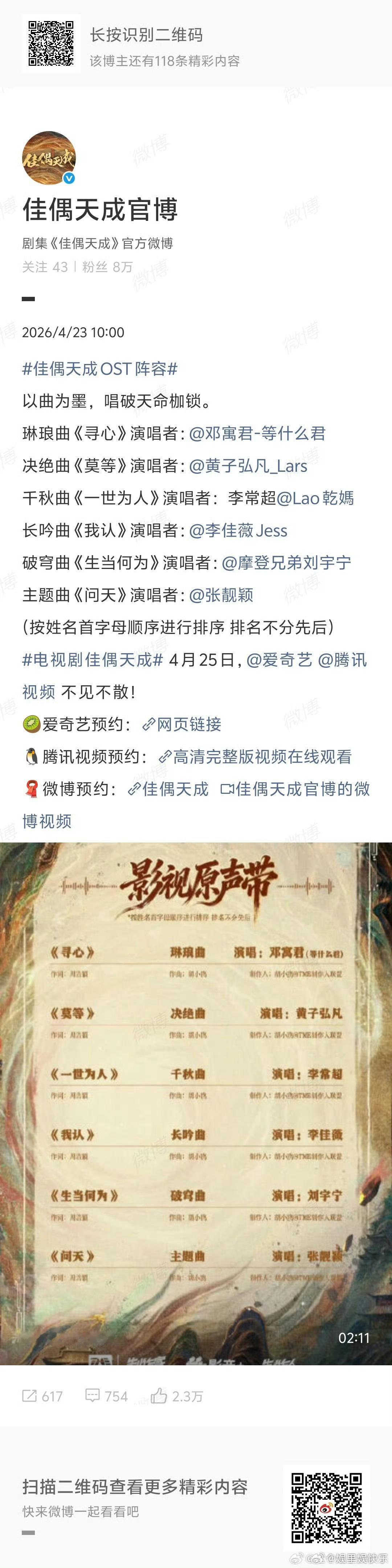 佳偶天成OST试听版多首OST风格鲜明,从深情到热血全覆盖,试听片段已让人期待正片与完整音源。