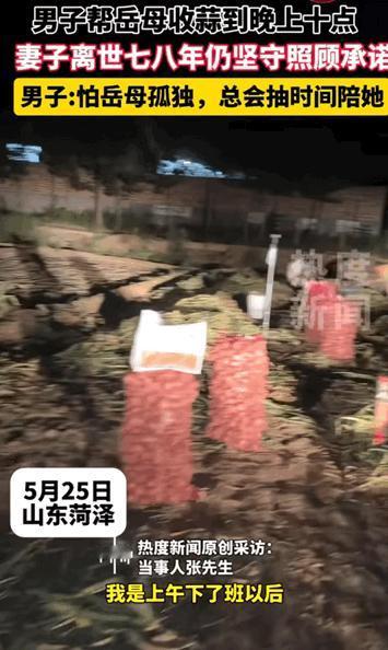 “这样的人品全国罕见!”山东菏泽,一男子曾帮岳母收蒜到晚上十点,就因妻子临终前托付他要好好照顾岳母,妻子已经离开七八年了,但男子一直坚守承诺。他怕岳母孤单,总是抽时间去陪陪岳母。网友:“这样的好女婿是丈人丈母娘宠出来的!” 山东菏泽是有名的大蒜种植区,每到五六月份,蒜田里就满是丰收的景象,蒜农们趁着晴好天气,抓紧时间采收、晾晒,忙得不可开交。男子的岳母也是当地的蒜农,种了几亩大蒜,每到丰收季,就会被繁重的农活压得喘不过气。 男子和妻子曾是邻里眼中的模范夫妻,两人感情深厚,孝顺双方父母,日子过得平淡而幸福。可天有不测风云,七八年前,妻子突发重病,医治无效离世,临终前,她紧紧拉着男子的手,托付他一定要好好照顾自己的母亲,不要让母亲受委屈。 妻子离世后,男子悲痛万分,却始终牢记着妻子的临终托付,从未有过一丝懈怠。他知道,岳母失去女儿后,内心孤独又脆弱,加上年纪渐大,身体也大不如前,根本无力独自承担地里的农活和家里的琐事。 从那以后,男子就主动扛起了照顾岳母的责任,不管自己工作多忙,都会抽时间去看望岳母,帮她打理家里的大小事务。平日里,他会给岳母买好吃的、买衣物,陪岳母说说话,缓解她的孤独,不让她有被抛弃的感觉。 每到大蒜丰收的季节,更是男子最忙碌的时候。菏泽的大蒜丰收季,蒜农们常常忙到深夜,有的甚至会请人帮忙采收,可岳母舍不得花钱,总是自己硬扛。男子看在眼里,疼在心里,每天忙完自己的事,就会立刻赶到蒜田,帮岳母收蒜。 有一次,大蒜丰收恰逢连日晴天,正是收蒜的最佳时机,岳母想着尽快把大蒜收完晾晒,避免受潮变质,一直忙到傍晚还没停歇。男子得知后,放下手里的事,匆匆赶到蒜田,陪着岳母一起收蒜,一干就是几个小时,直到深夜十点才结束。 那天晚上,夜色微凉,田间的蚊虫不停地叮咬,男子的手上、胳膊上布满了红疹子,腰也因为长时间弯腰变得酸痛难忍,可他从来没有抱怨过一句,只是默默干活,直到把最后一袋大蒜搬运到地头,才扶着腰缓缓休息。 岳母看着男子疲惫的模样,心里满是感动,也满是愧疚,常常劝他不用这么辛苦,自己能慢慢忙活。可男子总是笑着摇头,依旧坚持每天过来帮忙,他说,这是他对妻子的承诺,也是他应该做的事。 七八年来,男子始终坚守承诺,从未间断过对岳母的照顾。他不仅帮岳母干农活,还会在岳母生病时,及时送她去医院,悉心照料;在岳母心情不好时,耐心陪伴,逗她开心,把岳母当成自己的亲生母亲一样对待。 有邻居无意间拍下男子深夜帮岳母收蒜的画面,还有他日常陪伴岳母的片段,发布到网上后,很快引发了全网热议,播放量迅速攀升,无数网友被男子的坚守与善良打动,纷纷留言称赞。 不少网友留言说,这样重情重义、坚守承诺的人品,全国都罕见;还有网友感慨,这样的好女婿,从来都不是天生的,而是丈人丈母娘宠出来的,想必当年他和妻子在一起时,岳母一定也对他格外好。 男子得知自己走红后,十分淡然,他说自己只是做了该做的事,没有什么值得称赞的。他从来没有想过要得到什么回报,只是单纯地想完成妻子的托付,好好照顾岳母,让妻子在另一个世界能够安心。 如今,岳母的身体越来越好,脸上的笑容也越来越多,不再像以前那样孤独落寞。男子依旧坚守着自己的承诺,抽时间陪伴岳母、帮她干活,用自己的行动,诠释着责任与担当,也延续着对妻子的思念。 妻子离世七八年,他坚守临终托付,不离不弃照顾岳母,深夜十点帮岳母收蒜,不图回报,不求感恩。一份简单的承诺,一段漫长的坚守,藏着最真挚的情感,也温暖着每一个人。 对此,你们有什么看法,欢迎评论留言~