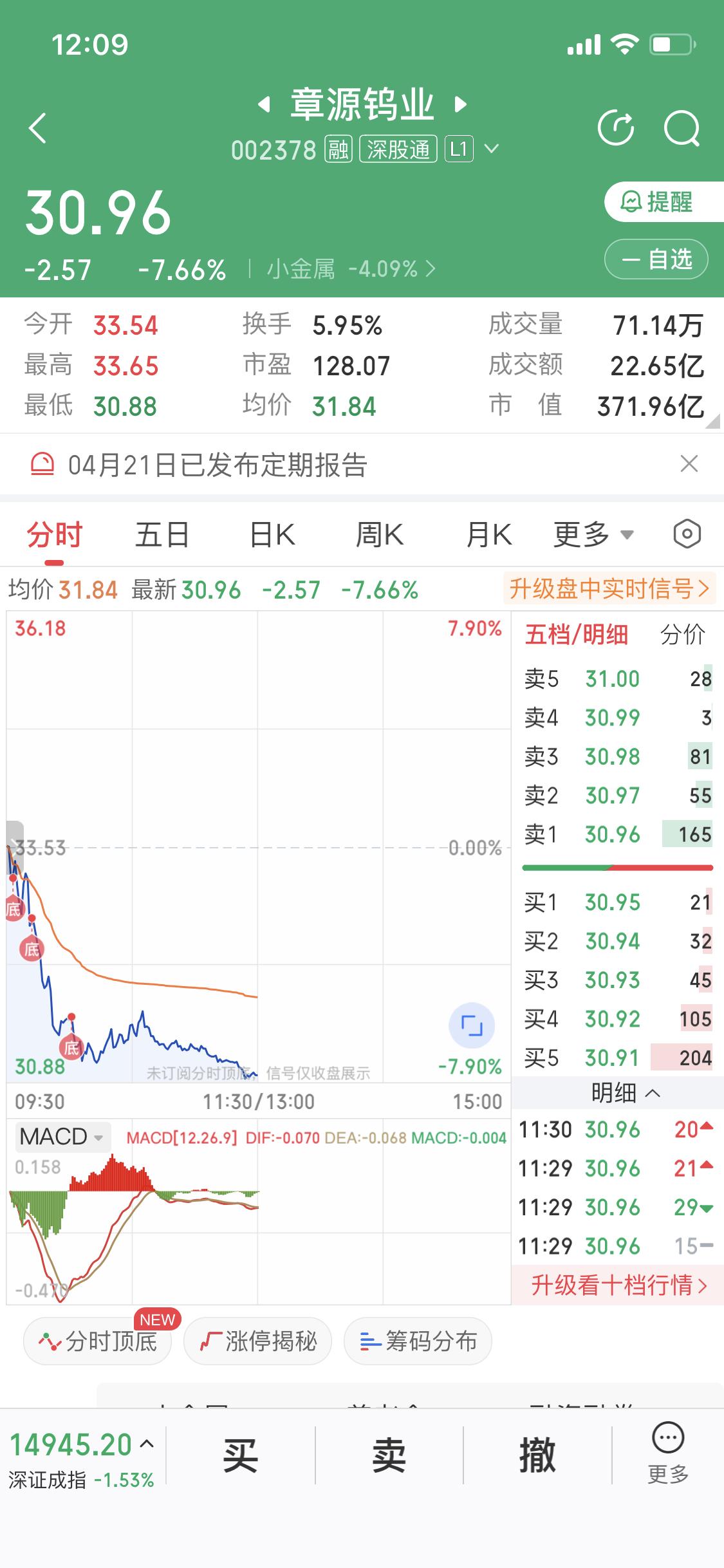 下午我可能要把章源钨业卖出了 扛不住了 这个票我两进两出 都没赚到钱 下跌7个点 大概率是主力出货了 下午割 如果明天反包 那就活该我在章源赚不到钱 拜拜了