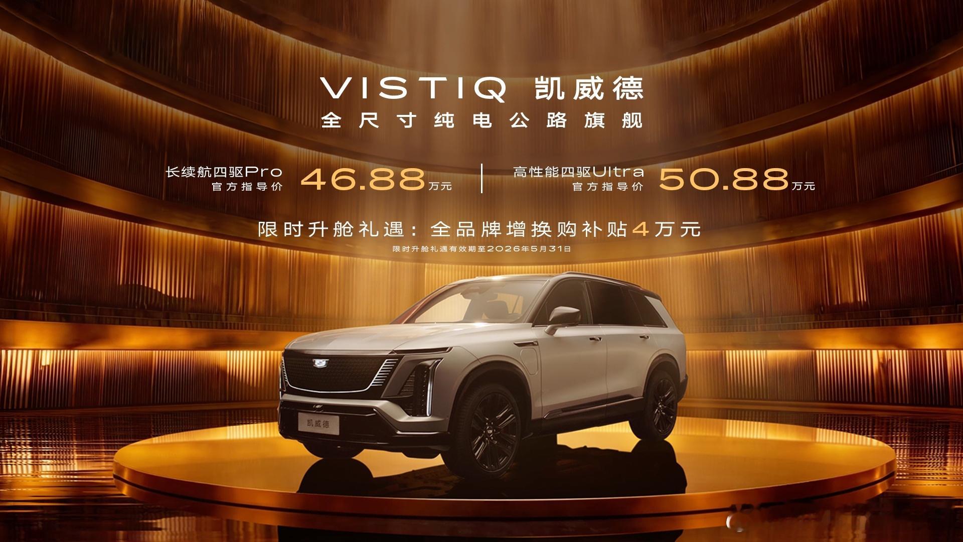 4月22日晚,凯迪拉克全新纯电车型凯威德VISTIQ在上海保利剧院迎来正式上市,新车定位美式豪华纯电SUV,官方公布售价区间为46.88万元-50.88万元,此次共推出长续航四驱Pro、高性能四驱Ultra两款配置版本,凭借硬核产品力与诚意购车权益,正式入局国内豪华纯电SUV市场。为回馈首批车主,新车上市发布会同步推出重磅购车权益,其中包含不限品牌均可享受的4万元置换礼,更有智驾无忧险、三电终身质保等八大首批车主专属权益,全方位降低购车门槛,保障用户后期用车无忧,进一步提升车型性价比。作为一款中大型豪华SUV,凯威德VISTIQ在车身尺寸与操控灵活性上实现完美平衡。车辆车长超5.2米,尽显旗舰车型的大气气场,同时凭借出色的底盘调校与工程设计,实现了仅5.56米的超小转弯半径,让这款大尺寸SUV在城市道路、狭窄车位等场景下,也能拥有灵活的操控表现,彻底告别大型车难操控的痛点。动力性能上,凯威德VISTIQ传承凯迪拉克驾控基因,搭载高性能双电机系统,整车综合马力高达602匹,动力输出强劲澎湃,零百加速时间最快仅需3.75秒,在同级别豪华纯电SUV中表现拔尖,既能满足日常舒适代步,也能带来极致的驾控激情。智能驾驶领域,凯威德VISTIQ实现技术突破,品牌与Momenta、禾赛科技达成深度合作,搭载SUPER CRUISE PRO高阶辅助驾驶系统,同时配备行业首款舱内隐藏式激光雷达,在保障座舱美观性的同时,大幅提升辅助驾驶的感知精度与安全性,实现更智能、更可靠的智能驾驶体验。内饰座舱方面,新车打造沉浸式科技驾乘空间,全车共搭载七块屏幕,构建起全维度智能交互体系。前排配备33英寸9K曲面环幕主屏,搭配70英寸AR-HUD、中岛车控屏以及流媒体后视镜,科技感拉满且操作便捷;后排则配备双12.9英寸娱乐屏与后排空调控制屏,兼顾前后排乘客的驾乘体验,完美诠释美式豪华与智能科技的融合。这款兼具大气设计、强劲性能、前沿智驾与豪华座舱的美式纯电旗舰SUV,入市后将直面国内豪华纯电SUV市场的激烈竞争。凭借凯迪拉克品牌百年豪华底蕴、硬核产品实力以及诚意权益,你认为凯威德VISTIQ在中国市场能否脱颖而出,收获消费者青睐吗? 纯电公路之王 凯威德