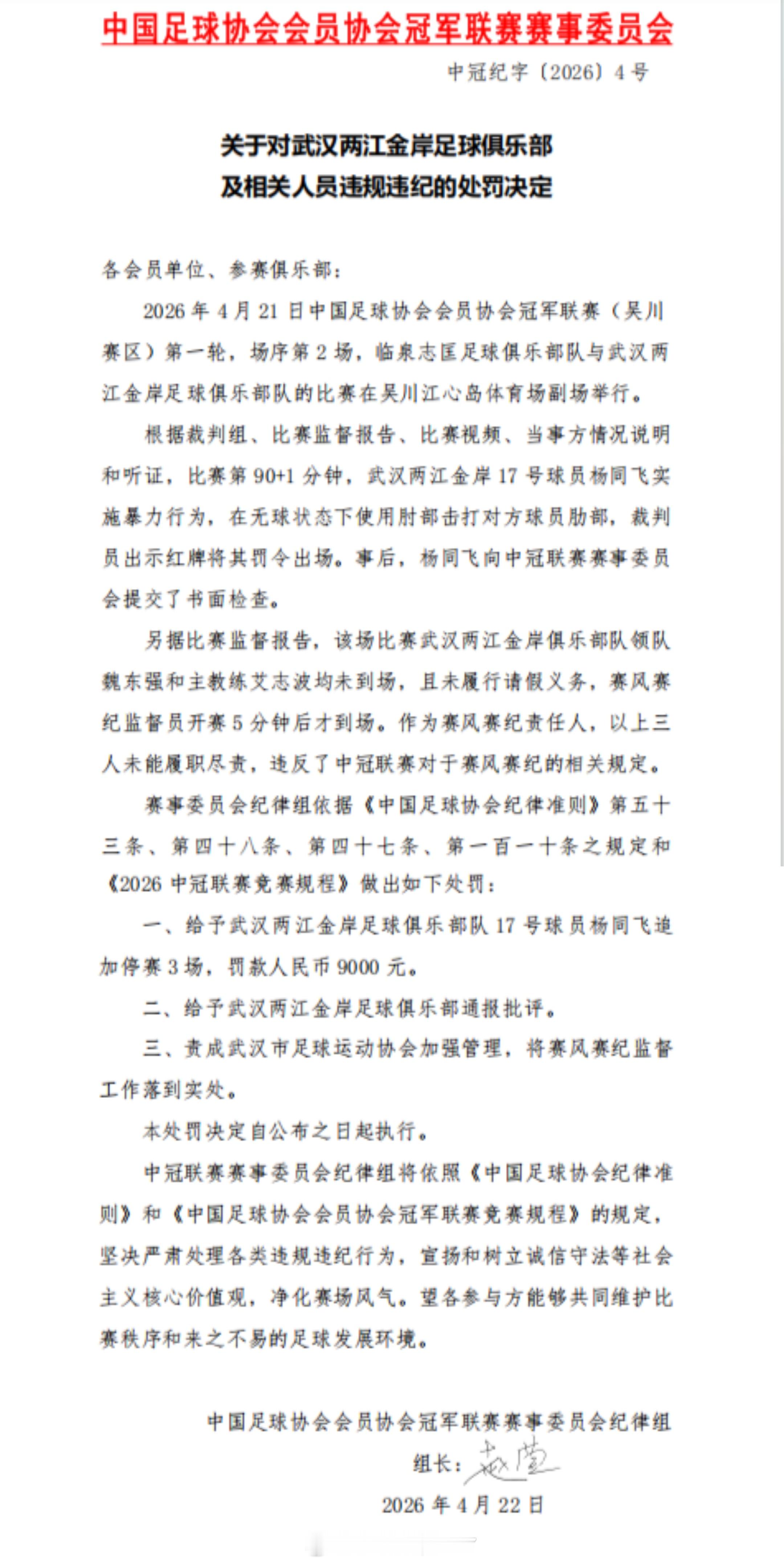 武汉两江金岸领队魏东强和主教练艾志波均未到场,且未履行请假义务,赛风赛纪监督员开赛5分钟后才到场。中冠联赛组委会决定给予武汉两江金岸球员杨同飞追加停赛3场,罚款人民币9000元,武汉两江金岸被通报批评。