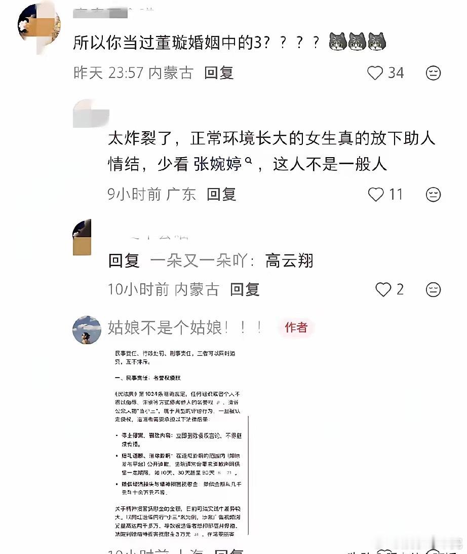 张婉婷否认介入高云翔董璇婚姻!昨天我还说张婉婷在和Q女士聊天的过程中给自己挖了很多坑,会让她哑巴吃黄连,有苦说不去。张婉婷自爆年轻时曾当3,网友对标她的工作经历,根据她曾给高云翔做过经纪人,推断出她插足高云翔董璇婚姻。当然这都是网友的臆想,没有事实根据。有网友跑到张婉婷社交平台留言确认,张婉婷发了图2的截图进行回应。