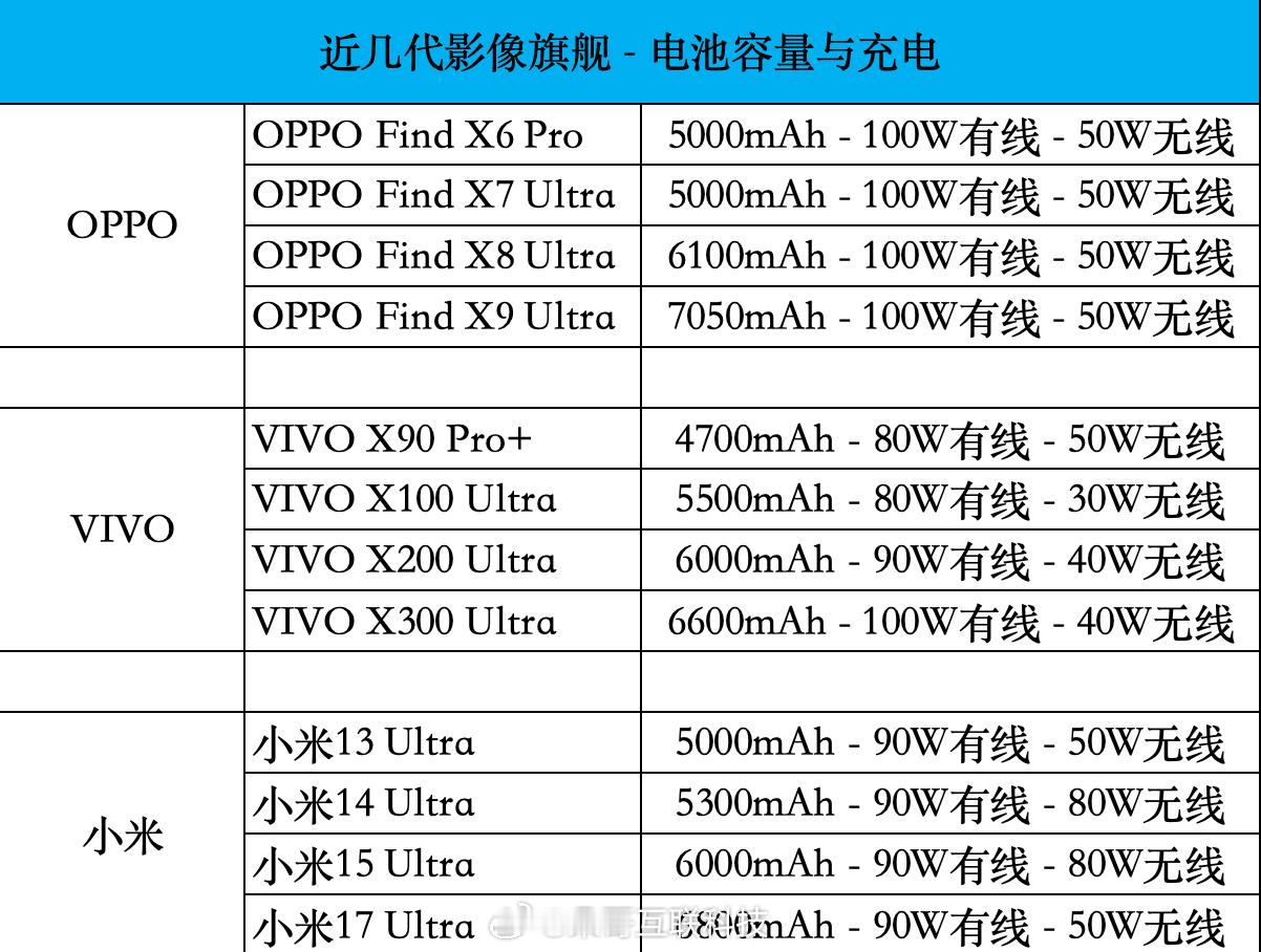 拢了一下近几代影像超大杯的续航情况发现O家的充电功率真够“专一”的