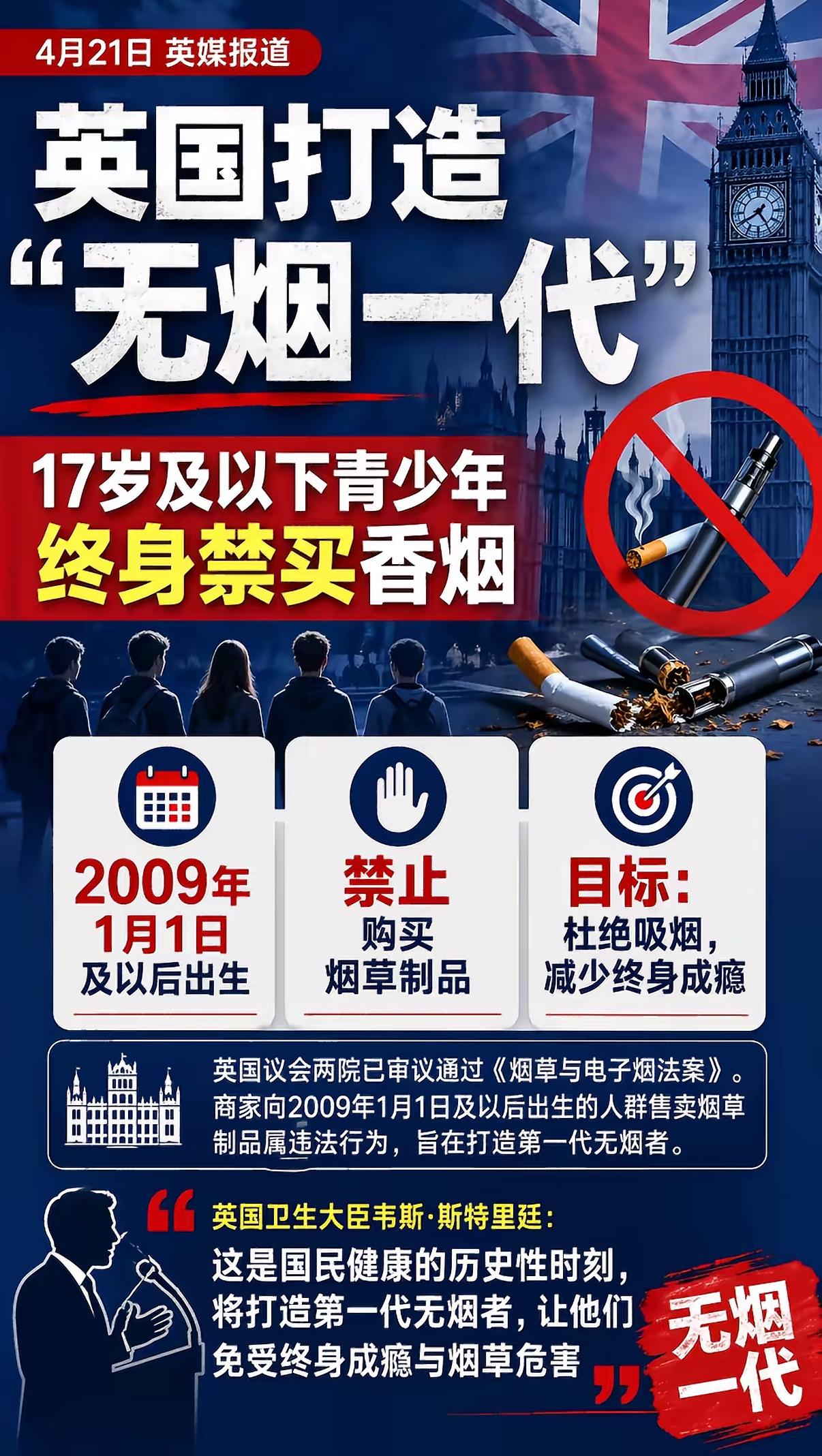 英国重大利民消息:“2008年后出生者终身不得购买香烟”,开始打造第一代无烟者。 英国议会两院已审议通过✅《烟草与电子烟法案》现年17岁以下的青少年被终身禁止🚫购买香烟🚬,这无疑是特大的利民好消息。 香烟禁令可以让下一代人终身免受香烟成瘾和烟草带来的危害⚠️,这一禁令法案的通过✅源于英格兰每年约有7.5万人死于吸烟,这一数字占全部死亡人数的四分之一,非常高的占比,禁烟🚭再不实行会有更多的人死于吸烟带来的危害。 不得不说英国🇬🇧又一次走到了世界的前列,这一法案的通过相信会让全世界其他国家慢慢的跟着效仿起来,随着时间的推移就会有越来越多的无烟区、无烟国家,人类的健康状况将得到大幅提升、地球的空气质量相信也会得到更好的改善。 英国 烟草 禁烟 香港禁止烟令 全球禁烟