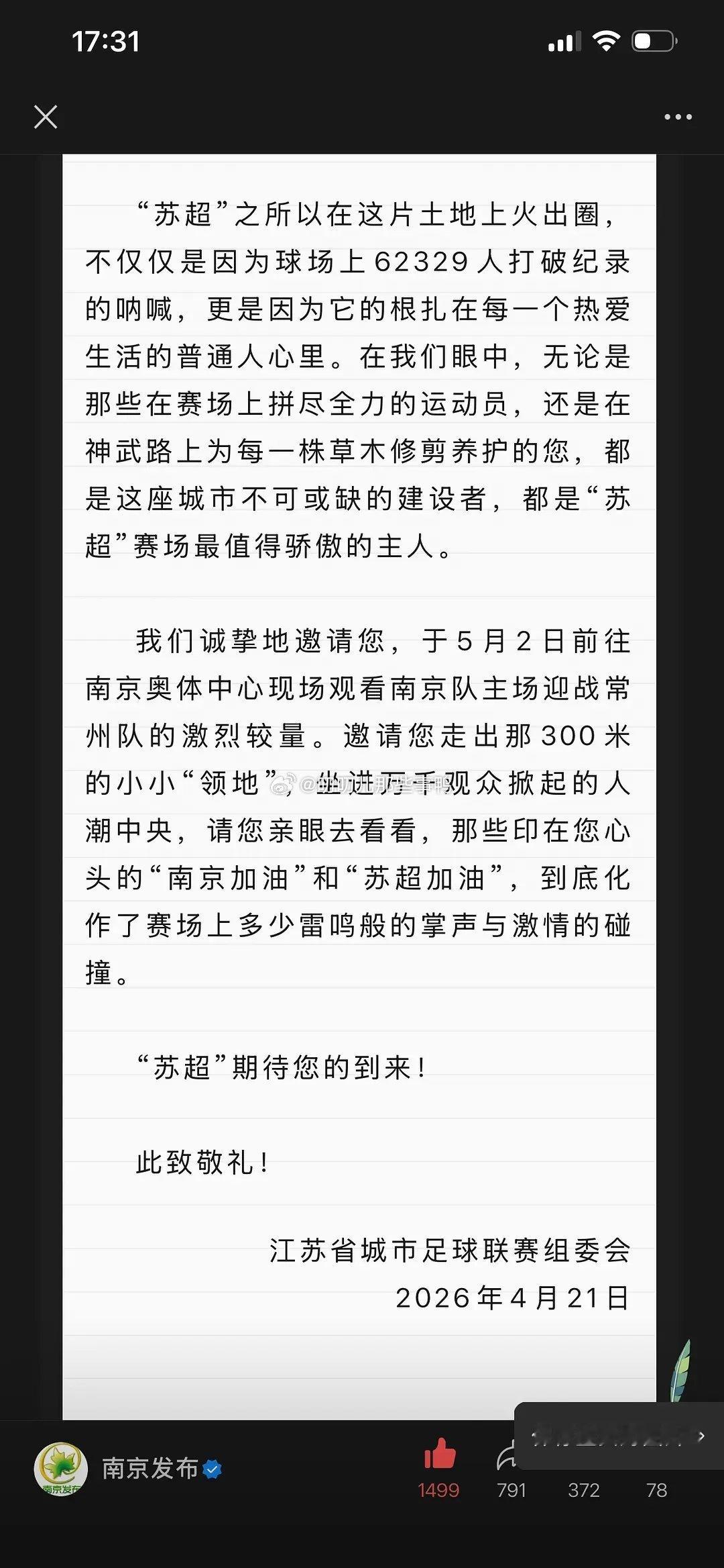 苏超五一劳动节之际,南京请来观战苏超的嘉宾不是任何一个208,而是劳动人