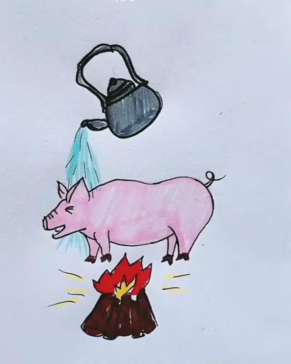 〔看图猜成语〕 图中画面真逗乐; 小壶就把猪头浇; 底下柴火还燃烧; 根据画面猜成语; 这题属实有点难; 仔细琢磨再分析。