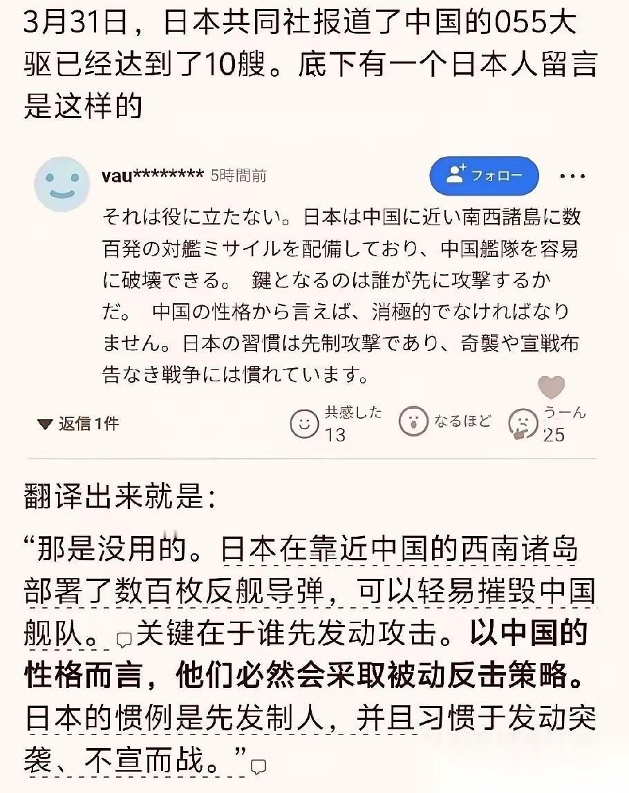 日本媒体报道了中国055大驱已经到达了惊人的10艘,然而一位日本网民直言,中国055大驱的发展“没用”,并声称日本的岸防火力网能让咱们的万吨巨舰灰飞烟灭。 光凭在几个破岛上凑一批岸舰导弹,就真以为能轻松拿捏局面了? 稍微懂点常识就知道,这笔“时间账”根本算不拢。 那头儿吹上天的升级版反舰武器,射程确实拉长了。可亚音速这个致命软肋怎么掩盖?想飞越上千公里的距离,这玩意儿在天上慢吞吞地得熬上一个多小时。 有这磨洋工的功夫,咱们的常规雷达喝杯茶都来得及反应,更别提舰队里那些能追踪多目标的区域防空盾牌了。这些飞得慢的大家伙,到了末端基本就是排队送人头的活靶子。 再算算“体系账”,他们错得更离谱。 有人可能还记得二战时的“大和号”。当初日军砸锅卖铁造出这艘火力极其狂暴的巨无霸,结果呢?脱离了战机掩护和体系支撑,硬生生让美军飞机当靶子炸进了海底。 现代海战,早就不兴单挑这一套了。 咱们的驱逐舰出门,头顶有战机罩着,水下有潜艇跟着,带的是一整个立体交战网络。反观对方顺着岛屿摆的那些岸炮连,其实全是没有纵深的孤立据点。靠几个死板的静态火力点,就想拦住全域协同的庞大舰队? 抱着几张纸面参数自嗨,压根看不懂现代海战体系降维打击的本质。这种战略眼光上的刻舟求剑,比拳头不够硬更要命。 对此,你怎么看?