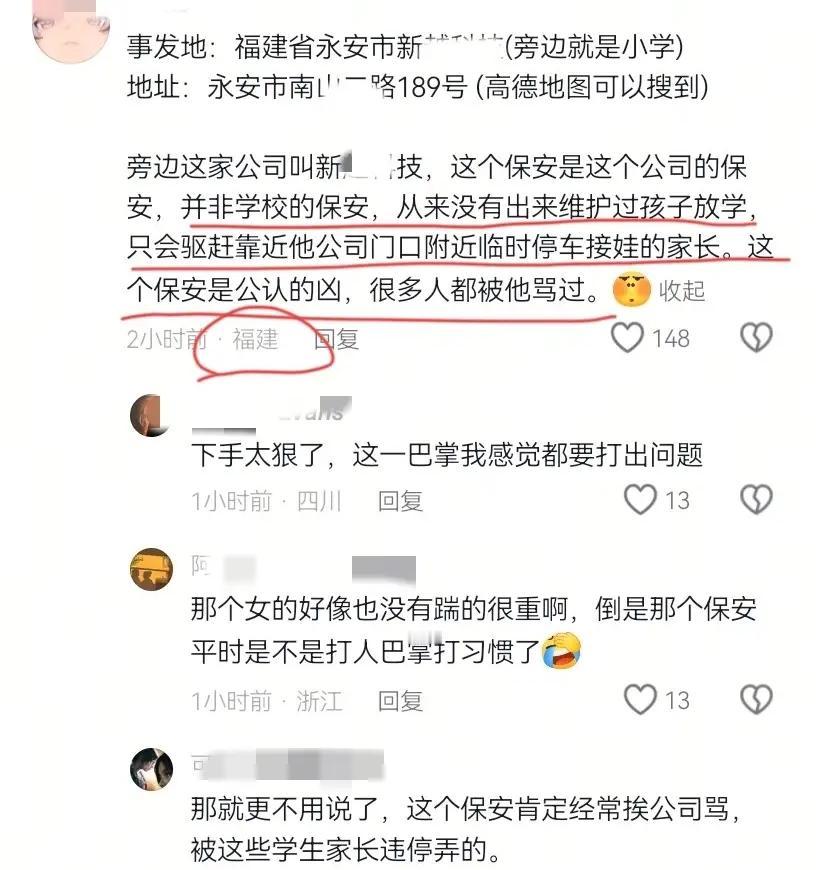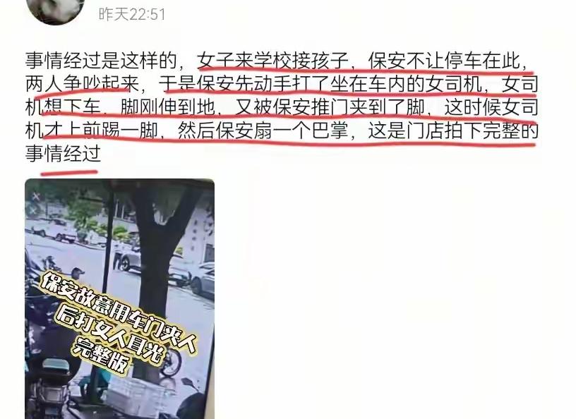 反转了,知情人爆料是保安先动的手,女家长被扇耳光致耳膜穿孔,保安大爷摊上大事了。 福建保安大爷怒扇女家长耳光这件事,众人是议论纷纷表达自己的看法,大多数都认为女家长占道没理还下车踢保安,是这位女家长先动手后遭到反抗扇耳光,不值得同情。 随着监控画面的曝光,舆论的天平开始发生了倾斜。 4月22日,放学的时间,家长占道与保安发生了口角。 知情人爆料保安让家长挪车并辱骂家长,女家长想下车理论,刚下车时被保安关车门压到了腿。 可能是太疼了气不过,女家长用脚去踢保安的小腿,结果被保安扇了一个耳光。从眼睛被打飞,家长脸红肿以及响亮的声音来看,这一巴掌确实扇的有点狠,有种故意报复的感觉。 经过鉴定,女家长耳膜穿孔,如果在6天内不能恢复,很可能就是轻伤二级,那时候保安大爷不仅要赔偿还可能面临刑罚。 原本还以为他是学校的保安,为了维护秩序所发生的冲突,结果根本不是这么一回事。 他是小学旁边一家科技公司的保安,只要是见到看到靠近他公司停靠的车辆就出来撵走,很多家长也都挨过他的骂,不是一个脾气好的人。 看来这是平常凶惯了,认为别人忍气吞声就走了,没想到这次惹了大祸,一年的工资可能都不够赔。 真的,遇事莫冲动。虽然女家长占道停车并妨碍你们公司,但也是劝离,不应该先用辱骂后再关门夹腿的方式来对待,这不是解决矛盾而是激化矛盾。 怎么说呢,双方都有错,女家长不应该占道停车,保安不该辱骂打人,如果双方都互相退一步,事件也不会发生。 看来,心平气和的沟通还是很重要的。