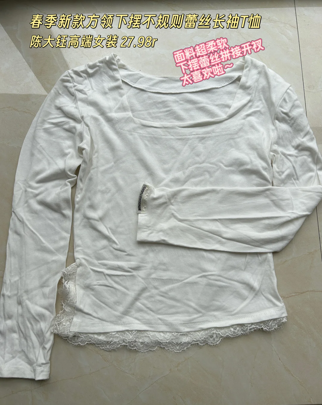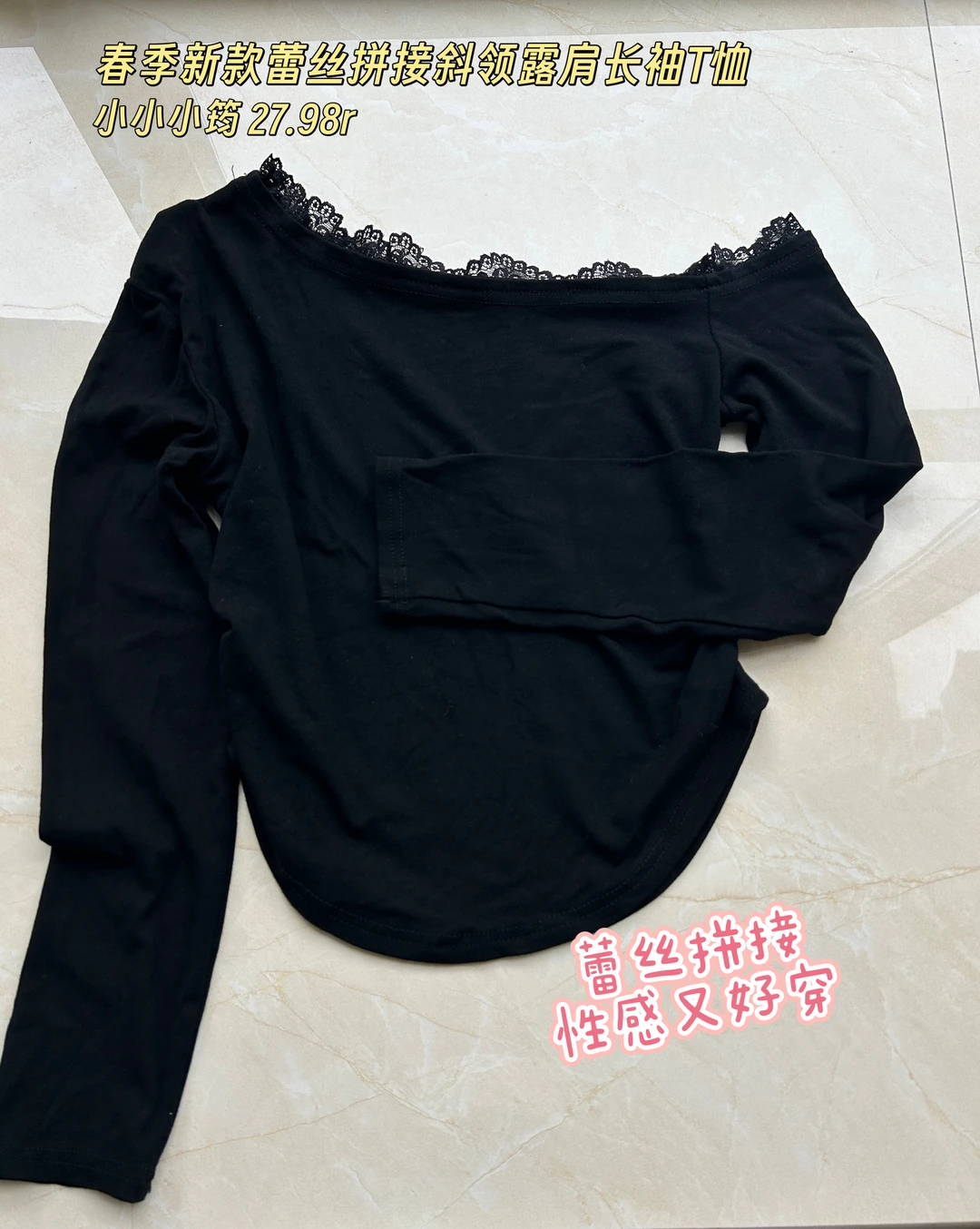 春季新款蕾丝拼接斜领露肩长袖T恤