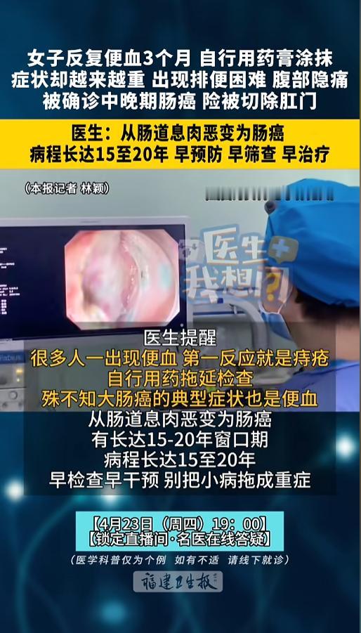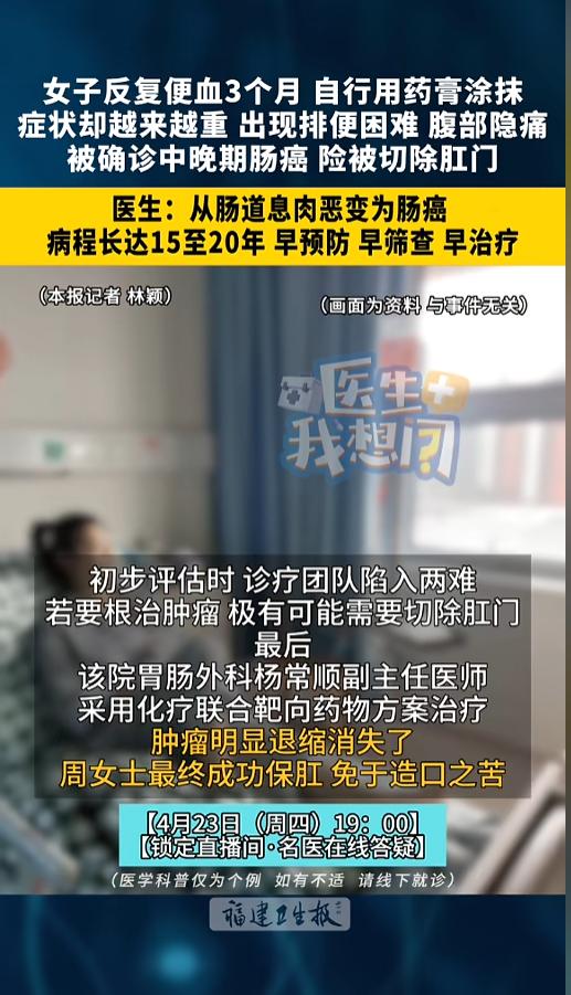 “悲剧还是发生了!”近日,福建福州,一女子出现了便血,她当是自己长了痔疮,就自行去拿了点药膏。可没想到,几个月过去,一直反反复复,最后身体实在撑不住了,才去医院检查。结果竟然是中晚期肠癌!网友:有症状就得去大医院? 据媒体4月22日报道,该女子今年才30多岁,这么小的年纪,就确诊中晚期肠癌,医生都觉得罕见。毕竟,从肠道息肉恶变成肠癌,一般都得十年起步,将近20年的时间。这么长的周期内,都没有检查过,实在是不应该。 女子这次去医院检查,也是迫不得已,身体实在扛不住了。三个多月前,她出现了便血,但是没有重视,就自己去拿了点治痔疮的药,自己涂抹了。 可是,用药之后,情况也没有好转,便血一直反反复复,还出现了排便困难,肚子也开始隐隐阵痛。哪怕这样,她也没有去正规医院检查,就一直自己扛着,直到最后,实在是扛不住了。 确诊之后,医生也犯难了,按一般治疗方法,想要根治,可能得把肛门一起切掉。最后,医生想出了一个新的治疗方案,用化疗联合靶向药物,最后效果不错,成功避免了切肛! 网友看后表示,现在条件是好了,可病也越来越多了,对普通人来说,看病也是个大麻烦事。就像这种癌症,小诊所医院查不出来,到大医院,花钱又厉害了! 信息来源:《福州女子反复便血 3个月,最终被确诊中晚期肠癌 险被切除肛门!医生:从肠道息肉恶变为肠癌,病程长达15至20年,莫让小病拖成重症》福建卫生报