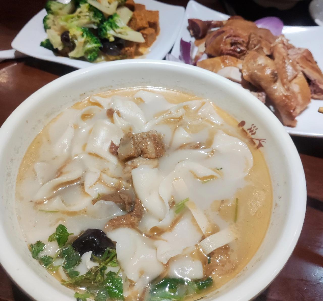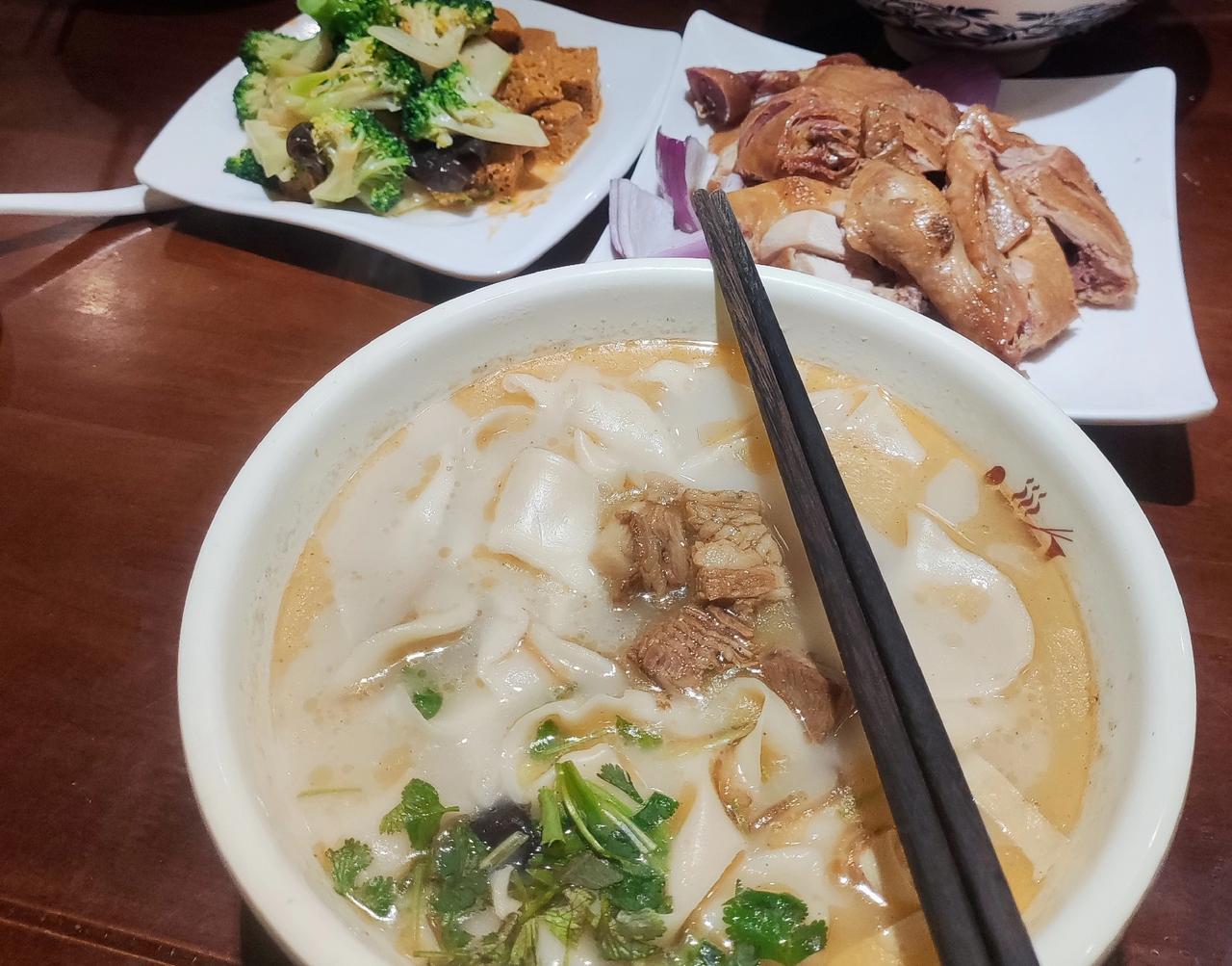 都说来郑州可以不吃胡辣汤,但一定要吃碗烩面。 上周郑州出差,刚好酒店附近有家烩面馆,正值饭点,人还挺多的。 问了下服务员,他家说羊肉烩面和卤鸡是他家的招牌,我就要了一碗小份羊肉烩面、半只卤鸡、又点了一个素拼。 差不多等了十来分钟,卤鸡和素拼先上桌,卤鸡吃了一口,还不错,不柴很香,素拼可能放芝麻酱了,我不是很喜欢。 又过了几分钟,羊肉烩面上桌,在西安我很少吃羊肉,闻不惯羊肉的膻味。 吃了一块羊肉,不膻!不愧是河南省面,汤很鲜,面条很滑溜,香菜的加持下很有食欲。 最终羊肉烩面吃完了,卤鸡没吃完打包了,素拼不是很推荐。