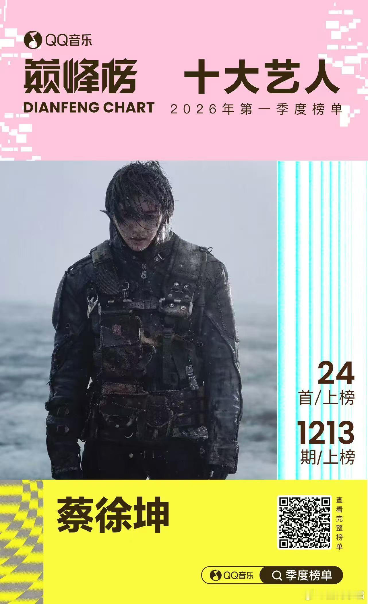 蔡徐坤QQ音乐巅峰榜双上榜Colder的成绩太硬核,夺冠次数和上榜次数都断层领