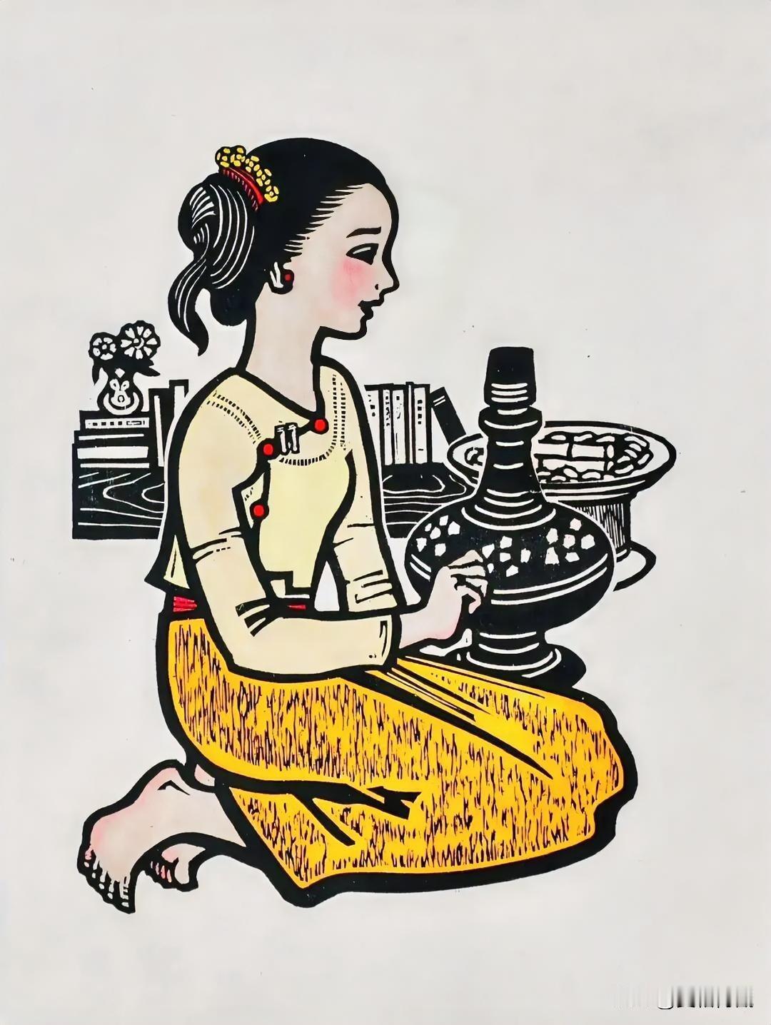傣族风情套色木刻版画《小卜少》蒋正鸿创作于上世纪五六十年代 吟诗赏石品佳