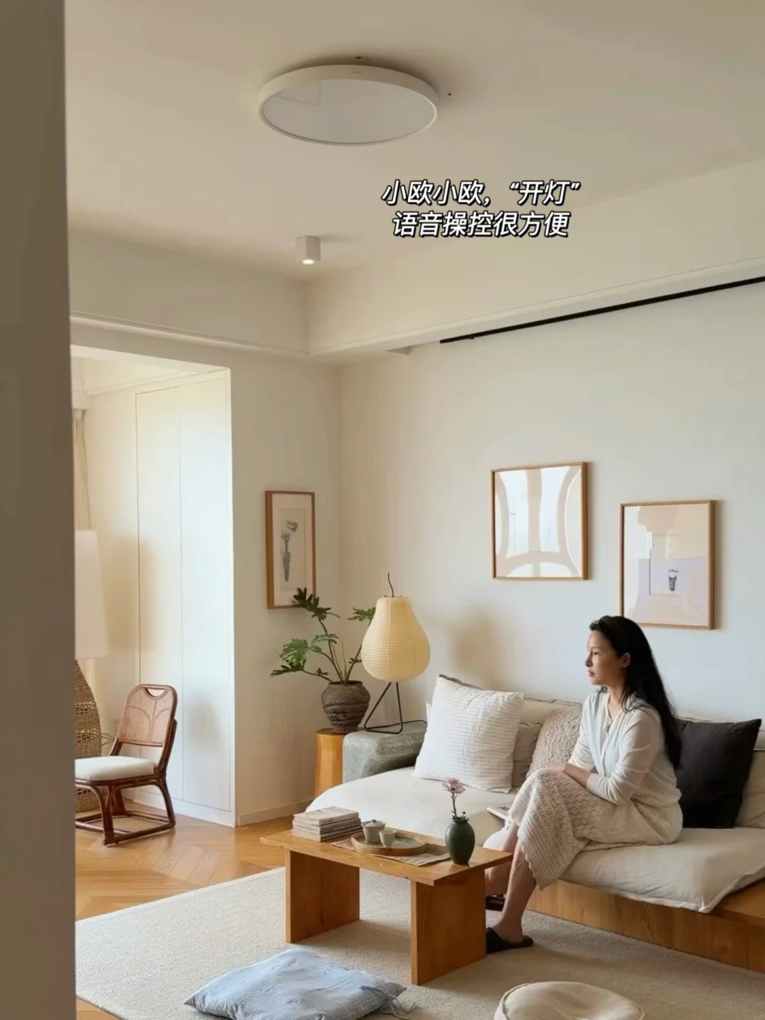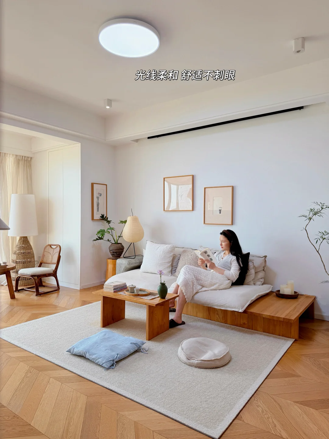 尤其我家朝西,光线不好的时候原木纹理总显得忽明忽暗。欧普自研的SDL光引擎技术能近1:1精准复刻太阳光,不管西晒多强、天色多暗,都能靠它调出柔和均匀的阳光,原木的温润质感终于被完美还原,再也不会显旧发灰、没层次。