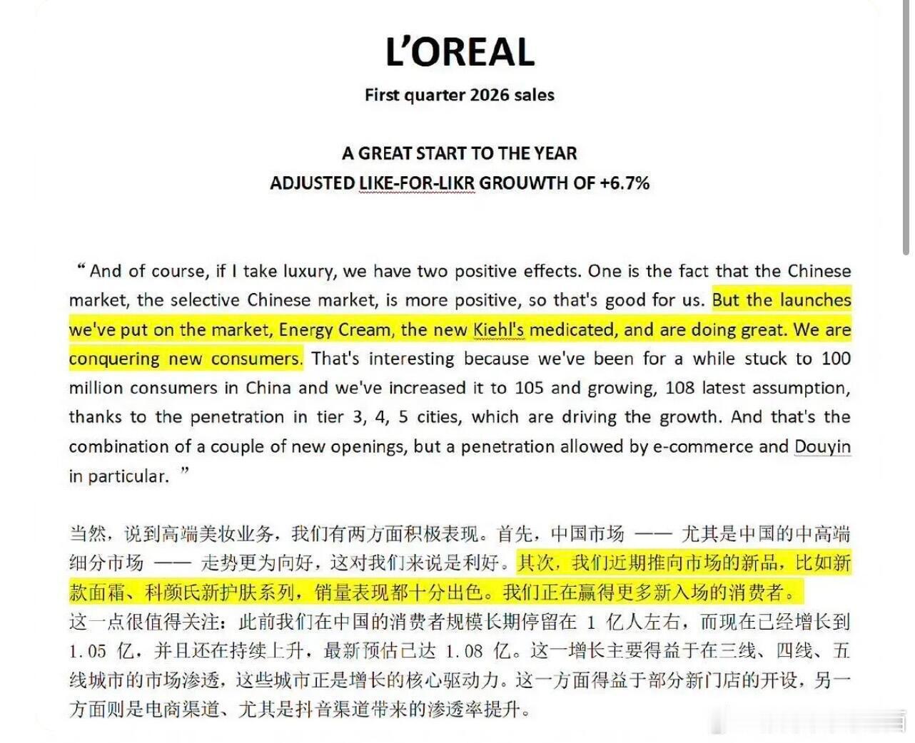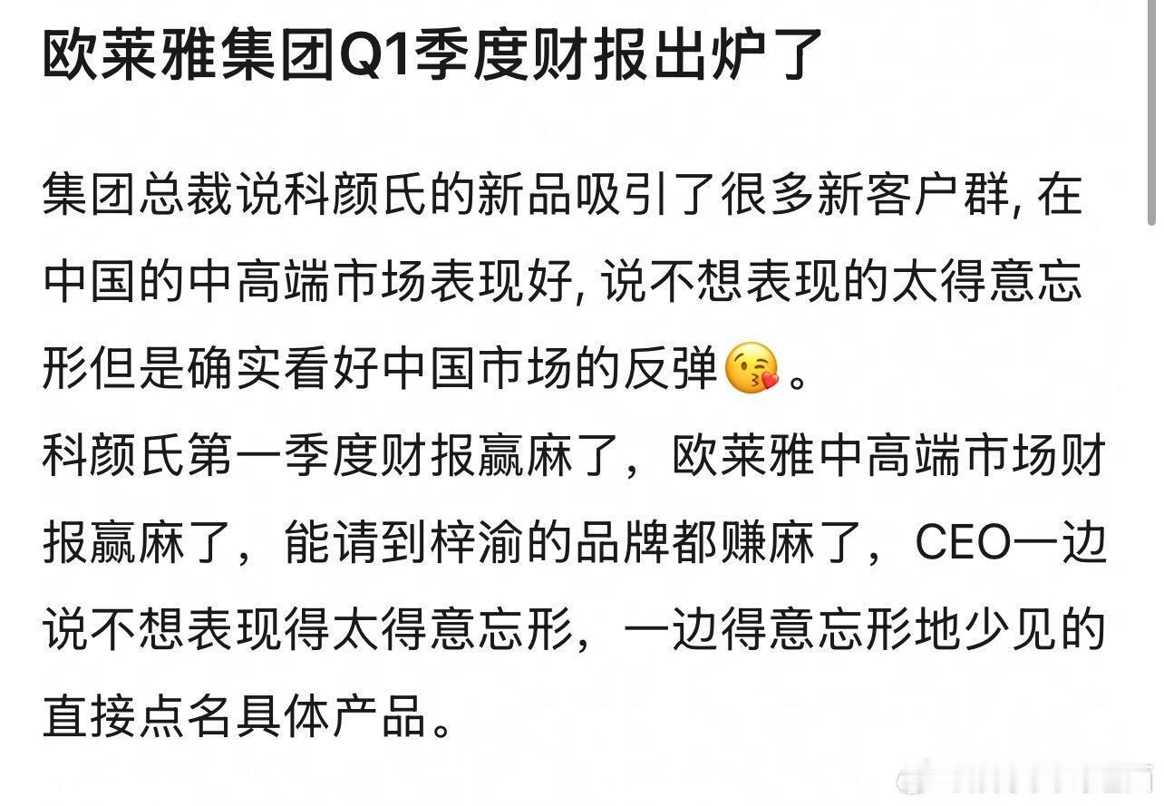 梓渝 请给我接一个这样的财神爷!梓渝选商务都是精挑细选,珍惜自己的商业价值,选品都是符合自身调性和粉丝需要的 欧莱雅集团总裁说科颜氏的新品吸引了很多新客户群,在 中国的中高端市场表现好,说不想表现的太得意忘 形但是确实看好中国市场的反弹