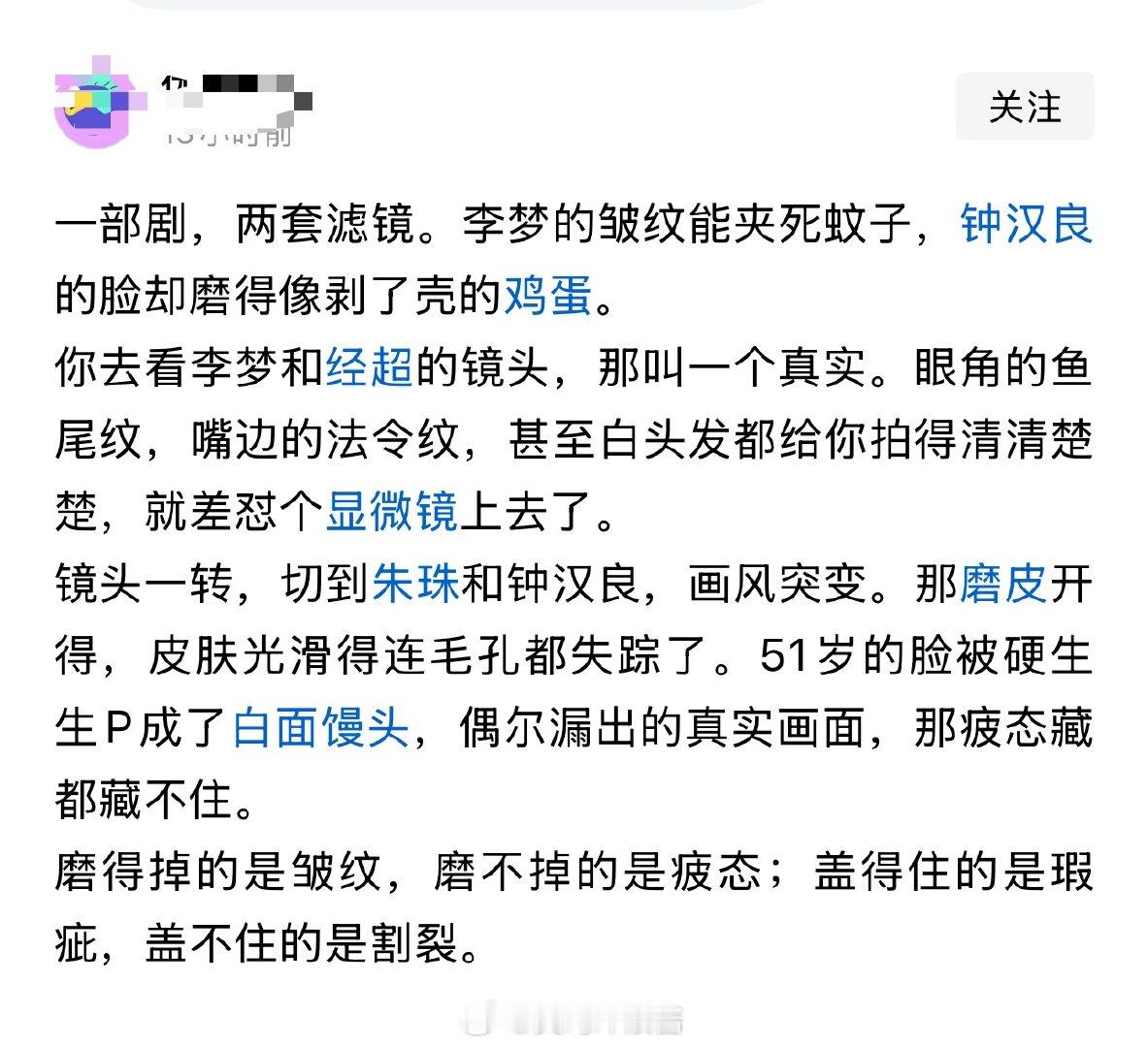 一部剧,两套滤镜。李梦的皱纹能夹死蚊子,钟汉良的脸却磨得像剥了壳的鸡蛋。