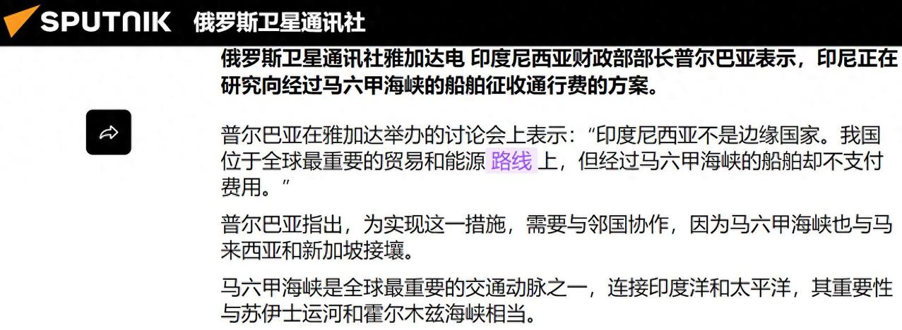 [太阳]伊朗行我也行?印尼呼吁对马六甲海峡收费,中国要多付千亿美元? 对于普通人来说,马六甲海峡或许只是地图上的一条水道,但它却深刻影响着我们的日常生活——我们用的电子产品、吃的进口食材,甚至加的汽油,很多都要经过这条“海上生命线”运输。 作为连接太平洋和印度洋的关键通道,马六甲海峡承载着全球40%的贸易往来,中国更是高度依赖它,超过60%的进口原油、一半以上的外贸物资都要从这里经过,说它是中国的“能源咽喉”一点不为过。 最近,这条安静的水道突然不平静了,两件事接连发生,牵动着全球目光,也让不少人担心:中国的贸易成本会不会大幅增加?第一件事,美国盯上了马六甲,借着防务合作向印尼递出“橄榄枝”。 4月13日,美印尼防长在华盛顿签署了重大防务合作协议,表面上看,是印尼想靠美国的技术和资金,升级本国老旧的军事装备,提升国防实力。 但明眼人都能看出,美国的心思没这么简单。 它真正想要的,是借助印尼的地理位置,在马六甲海峡建立监控网络,掌控亚太地区的海上运输主动权,进而牵制中国发展。 更值得警惕的是,美国还要求印尼允许美军飞机全天候、不受限制地飞越其领空,这相当于让美国牢牢握住了印尼领空的“钥匙”,方便其在南海开展侦察活动。 这一提议也让印尼内部吵翻了天。 印尼国防部想靠美国升级装备,态度偏向妥协;但外交部坚决反对,认为这会损害国家主权,背离印尼长期奉行的不结盟政策。 毕竟,中国是印尼重要的贸易伙伴,雅万高铁等合作项目惠及双方,印尼也不想彻底得罪中国。 就在印尼陷入两难之际,第二件事又来了:印尼财政部长4月22日表示,正探讨对途经马六甲海峡的船只收费,灵感来自伊朗对霍尔木兹海峡的收费模式,还说收取的费用会用于三国民生项目。 消息一出,很多人担心中国会受影响。 要知道,途经马六甲的船只中,中国相关船只占了一半,如果按照伊朗的收费标准,中国每年可能要多花上千亿美元,这无疑会增加贸易成本,最终可能影响到普通人的生活。 但大家其实不用过度担心,印尼这个收费提议,大概率是“纸上谈兵”,落地难度极大。 首先,马六甲是天然水道,根据国际法,沿岸国家无权收费,新加坡和马来西亚也明确反对,印尼没了共管国支持,根本推行不下去。 其次,马六甲不是唯一的通道,如果强行收费,各国船只会选择绕行,甚至可能推动中泰克拉地峡运河落地。 一旦这条运河建成,马六甲的战略地位会大幅下降,印尼不仅收不到钱,还会失去相关收益,得不偿失。 另外,伊朗的收费模式也根本没法参考,伊朗不是《联合国海洋法公约》缔约国,其收费本身就有争议,而马六甲涉及全球多数国家利益,没人会允许印尼擅自收费。 印尼自己也承认,这个提议还在早期阶段,短期内不会实施。 说到底,不管是美国想染指马六甲,还是印尼想收费,本质上都是在争夺这条水道的战略价值。 对印尼来说,与其依附美国、空想收费,不如保持战略自主,和中国等国家好好合作;对中国而言,虽然面临潜在挑战,但也会坚定维护自身权益,守护好这条“海上生命线”。