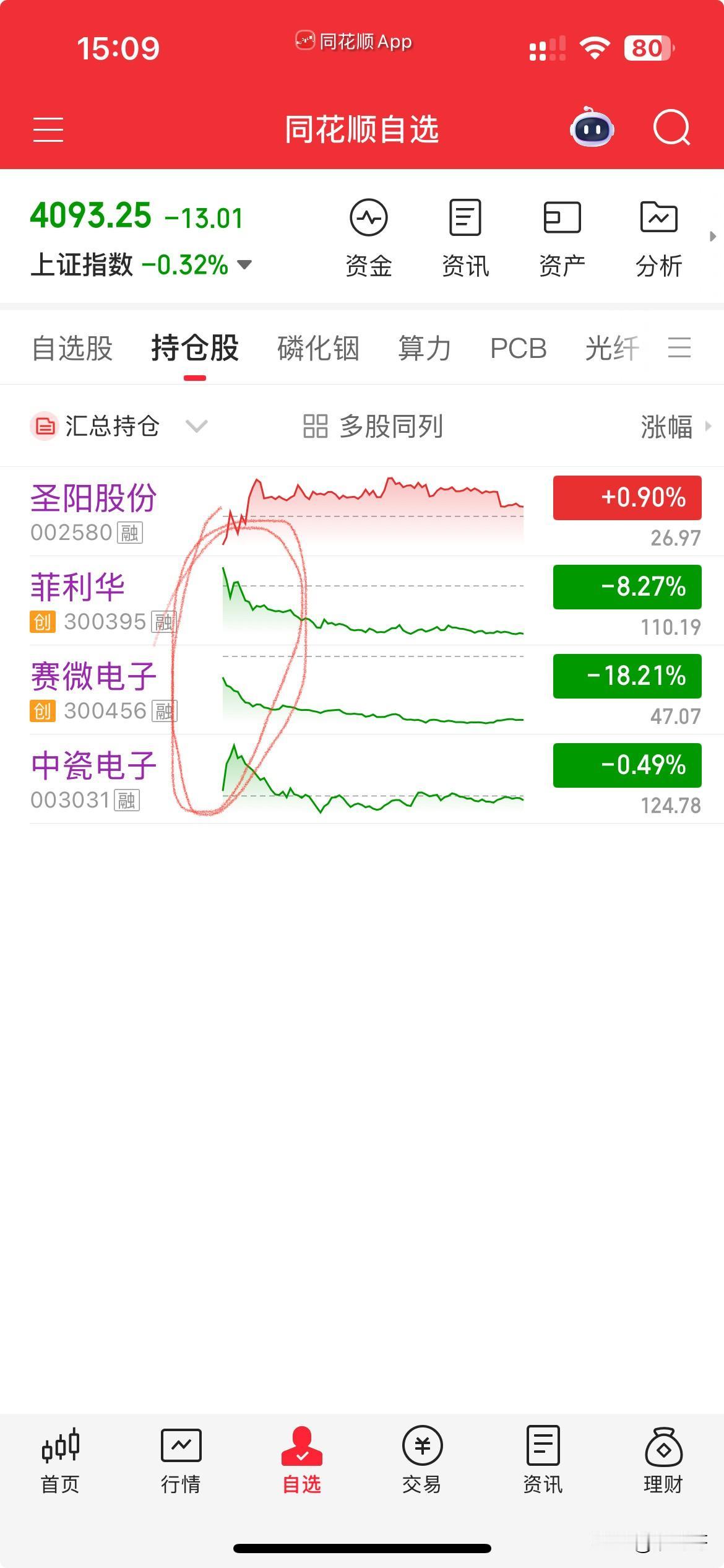 4月23日,个人操作汇总: 一,清仓:无, 二,新开:圣阳, 三,继续持有:中瓷,赛微,菲利华, 今天清仓无,主要赛微,菲利华大跌, 舍不得割肉,导致大出血, 圣阳,调整第四天了,接了点, 中瓷,又是冲高回落,连续四天了,明天该表现了吧, 今天真是亏麻了,辛辛苦苦大半年,一夜回到解放前[捂脸],早盘要清盘还不亏呢,谁知道后面是温水煮青蛙, 今天大盘指数调整不多,个股惨不忍睹, 盘面上算电这块最强,逆势,另外大盘不好,银行股就护盘, 希望明天科技回流吧!