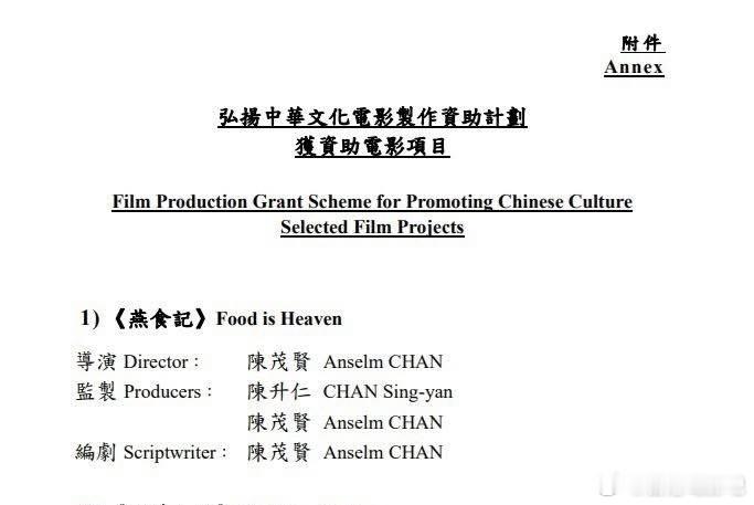 《破·地狱》导演陈茂贤的新电影——电影发展基金下弘扬中华文化电影制作资助计划,获资助电影项目《燕食记》。