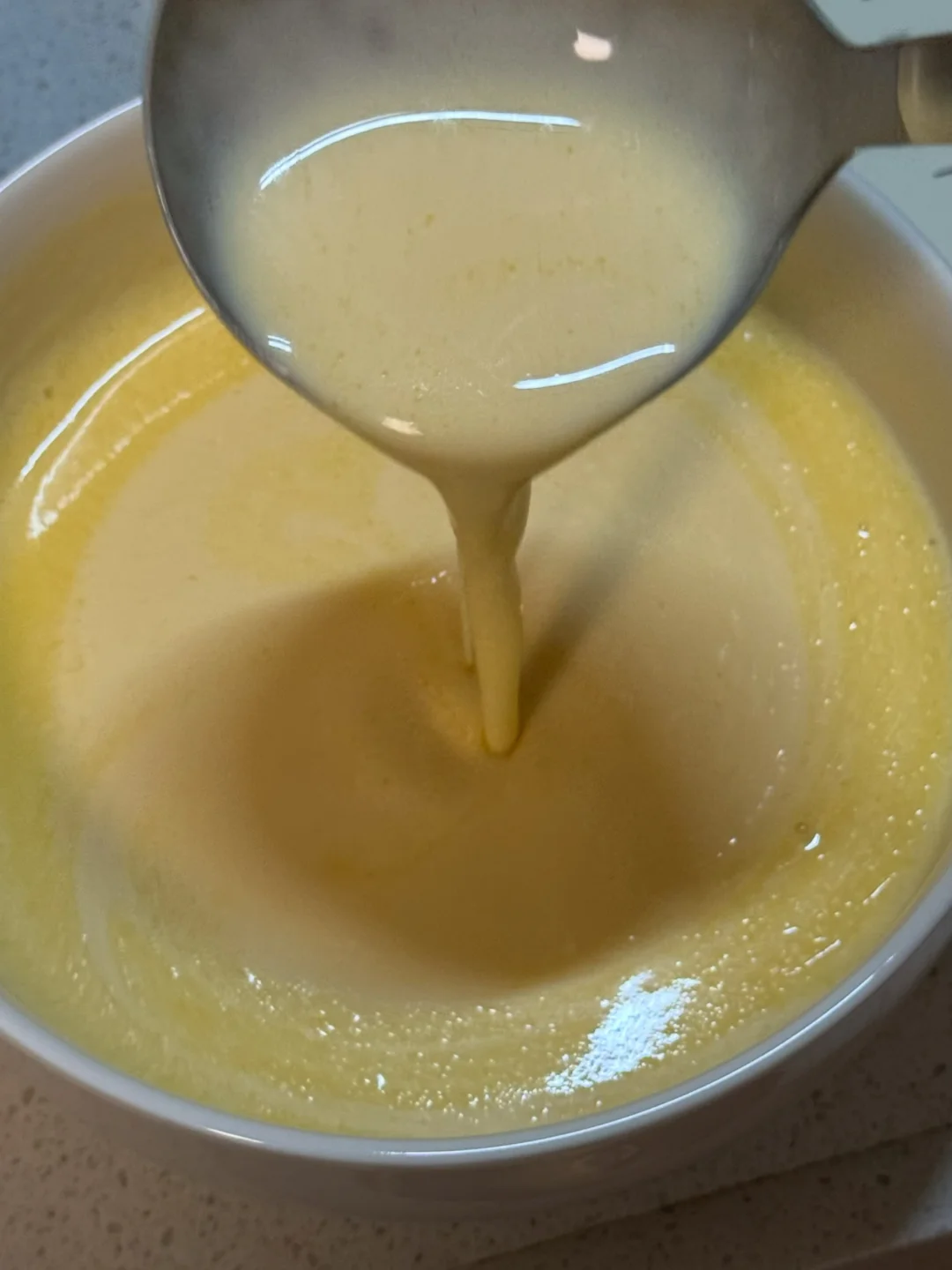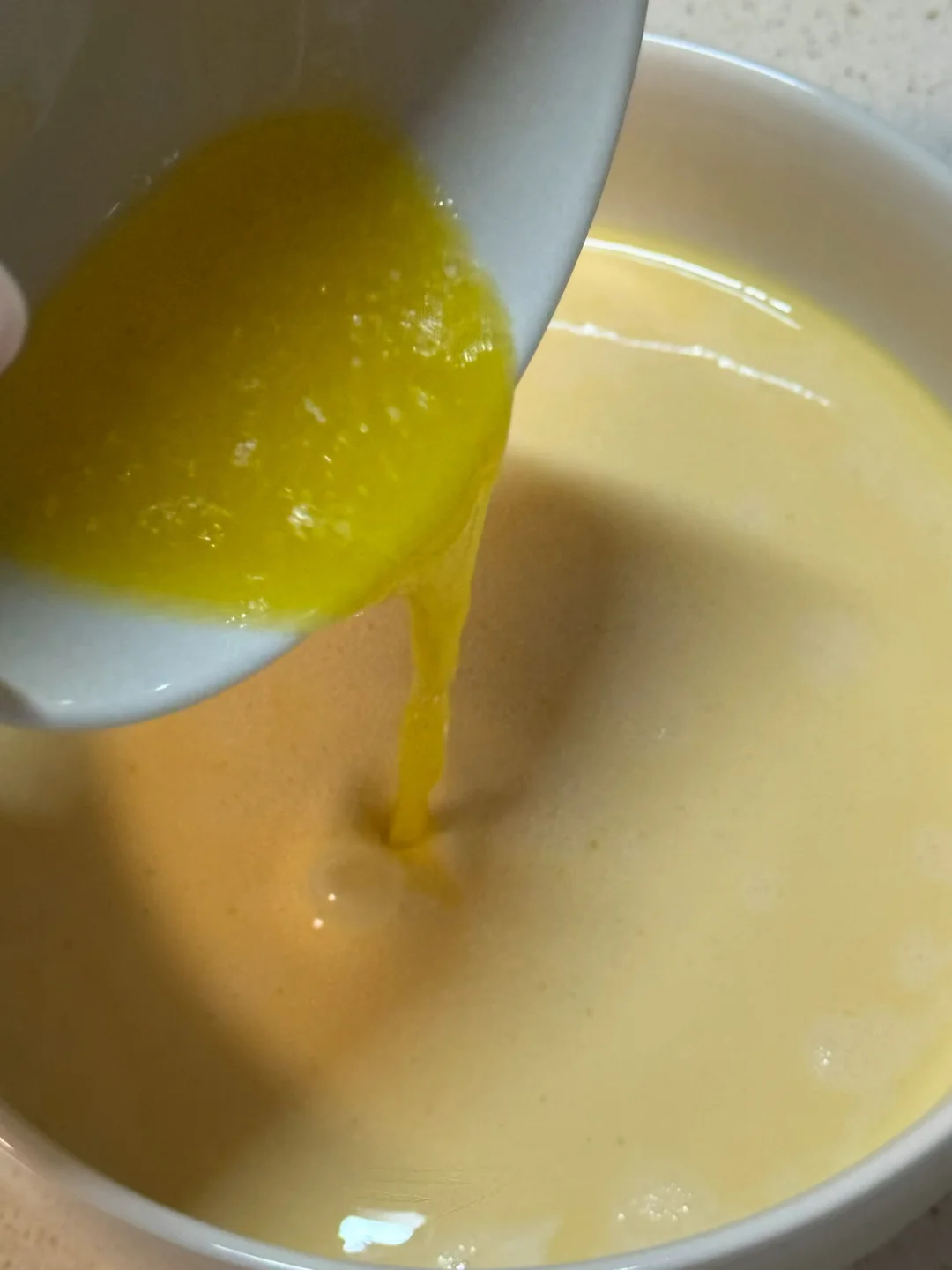 2.鸡蛋、牛奶、细砂糖、低筋面粉、融化后的黄油搅拌均匀,过筛三次,放冰箱冷藏一小时再用。