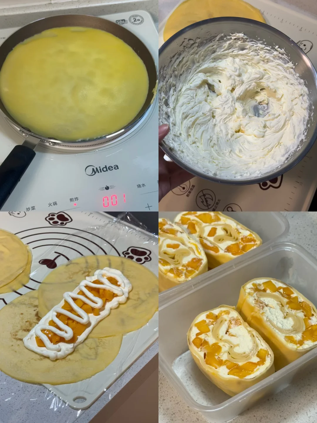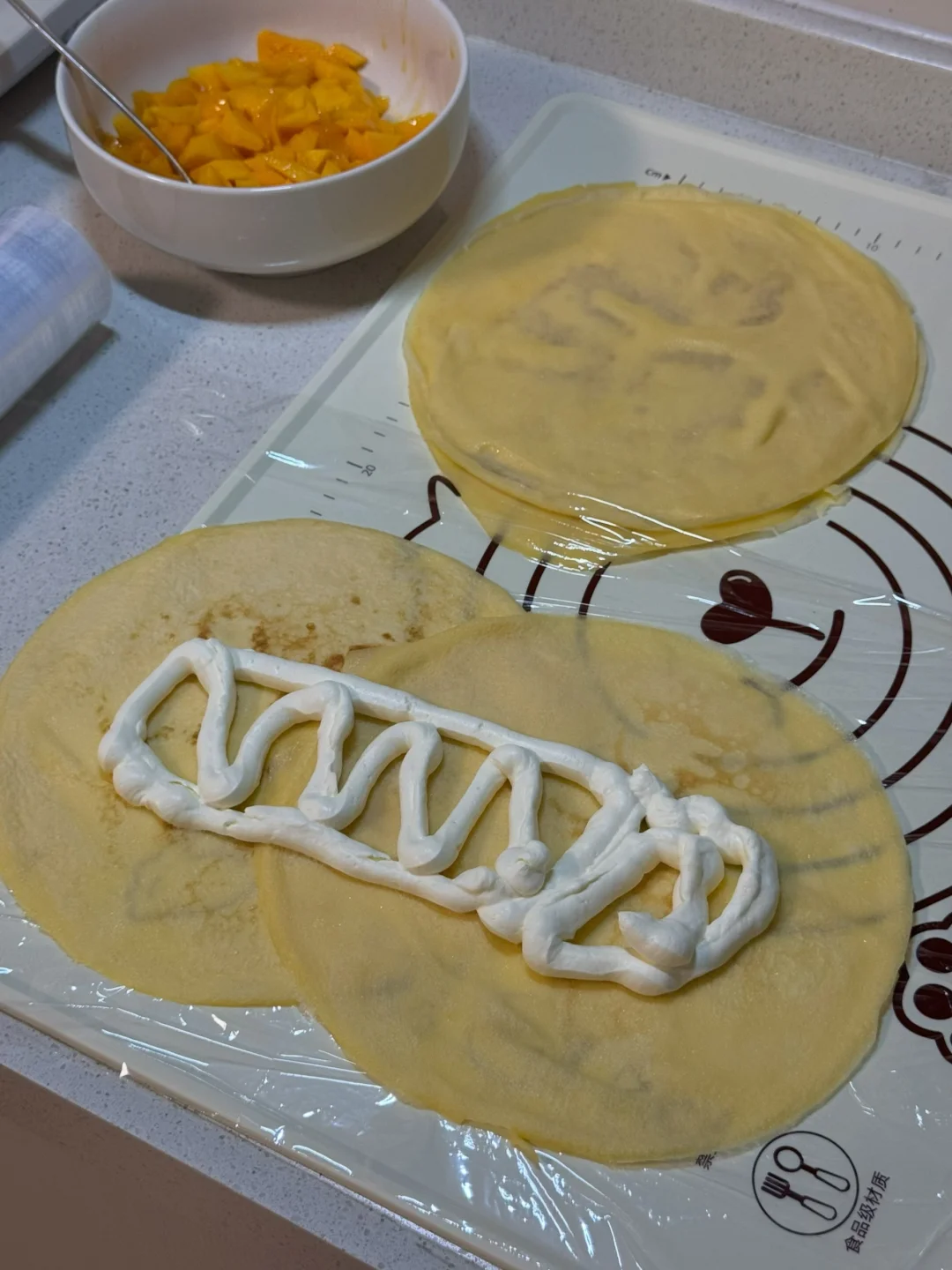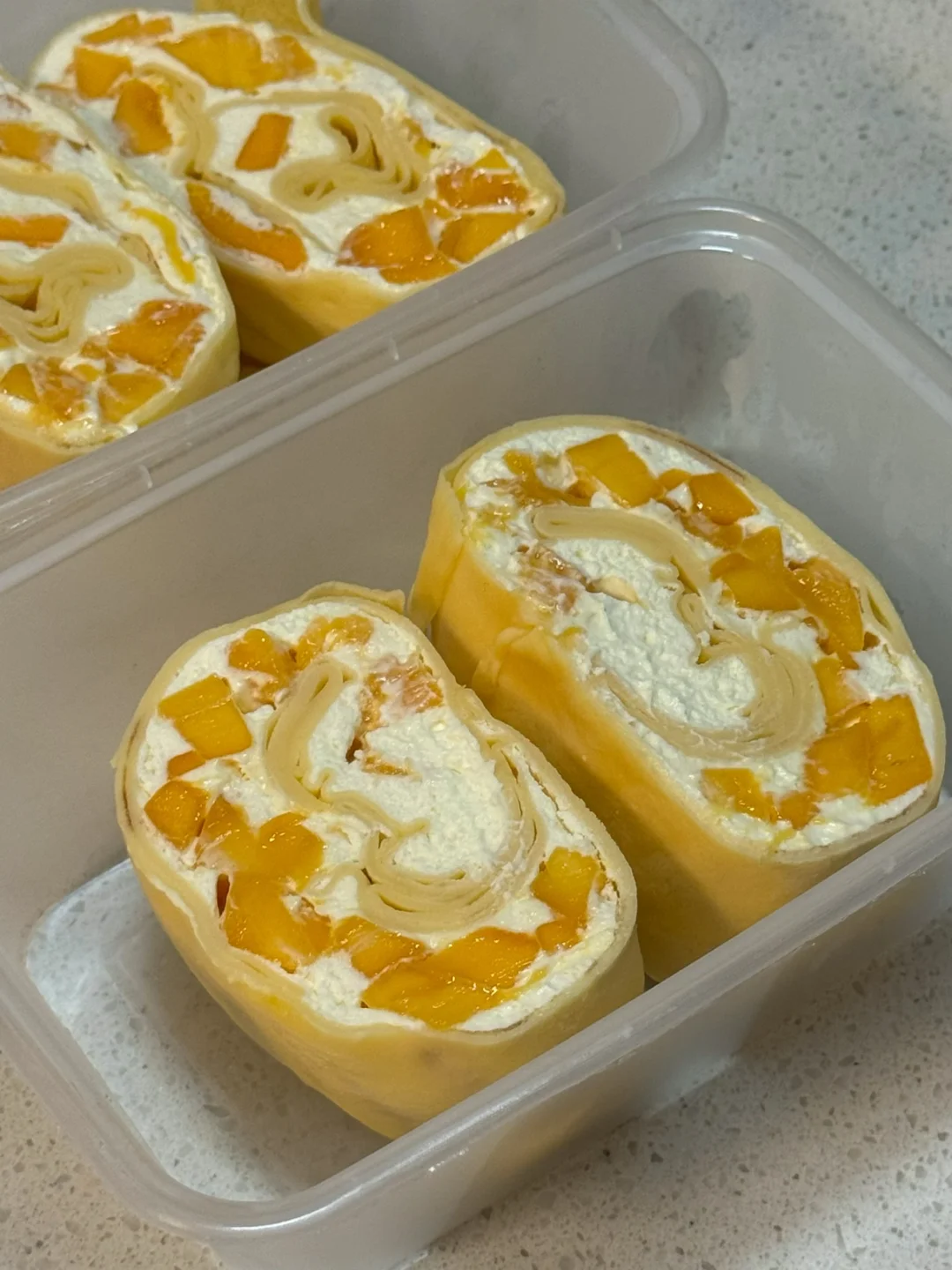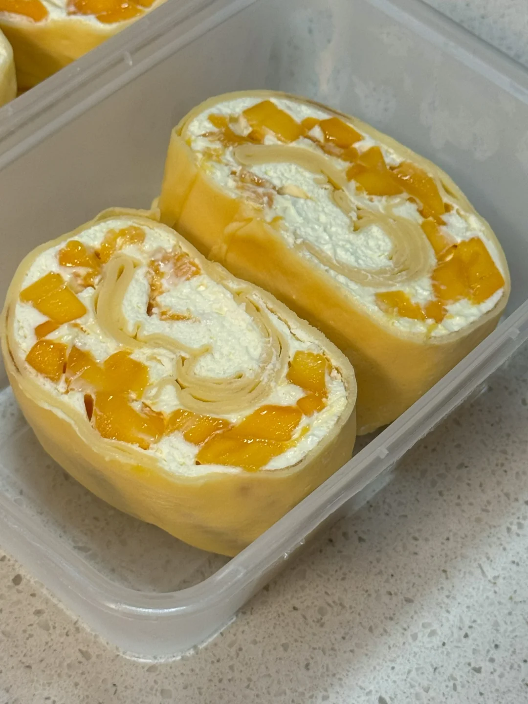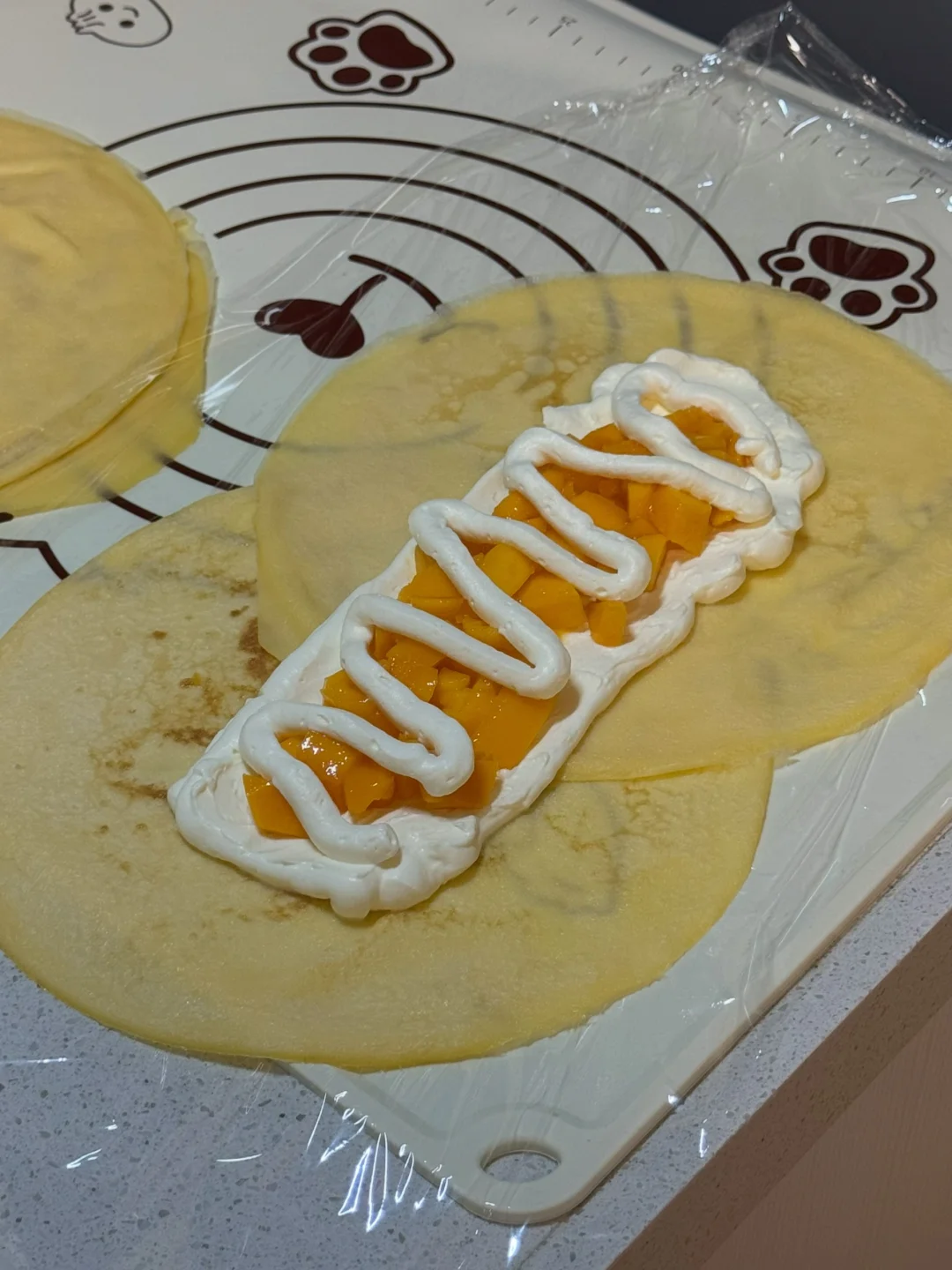 5.先垫一层保鲜膜,面皮好看的那面朝下,两张叠加,先挤一圈奶油,用刮刀抹平,放上芒果块,再挤上一点奶油,两边往里收,再从下往上卷起,再裹上保鲜膜放冷冻半小时再切,切面就会很好看。