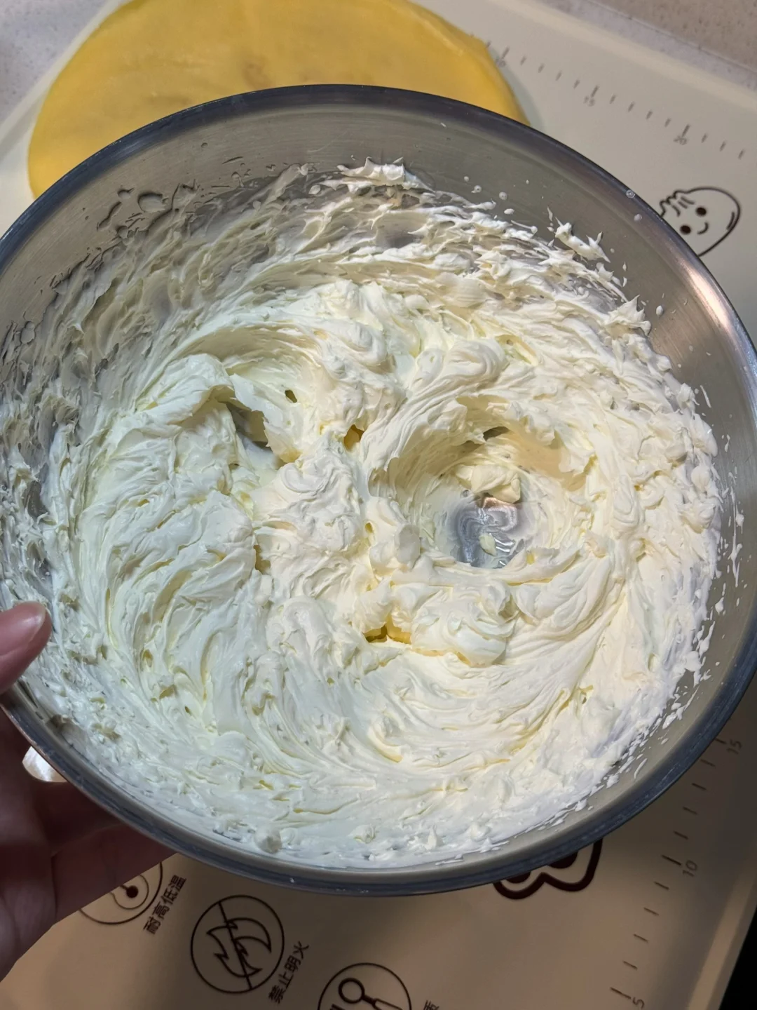3.淡奶油记得一定要提前冷藏,如果天气太热,可以开空调操作打发。