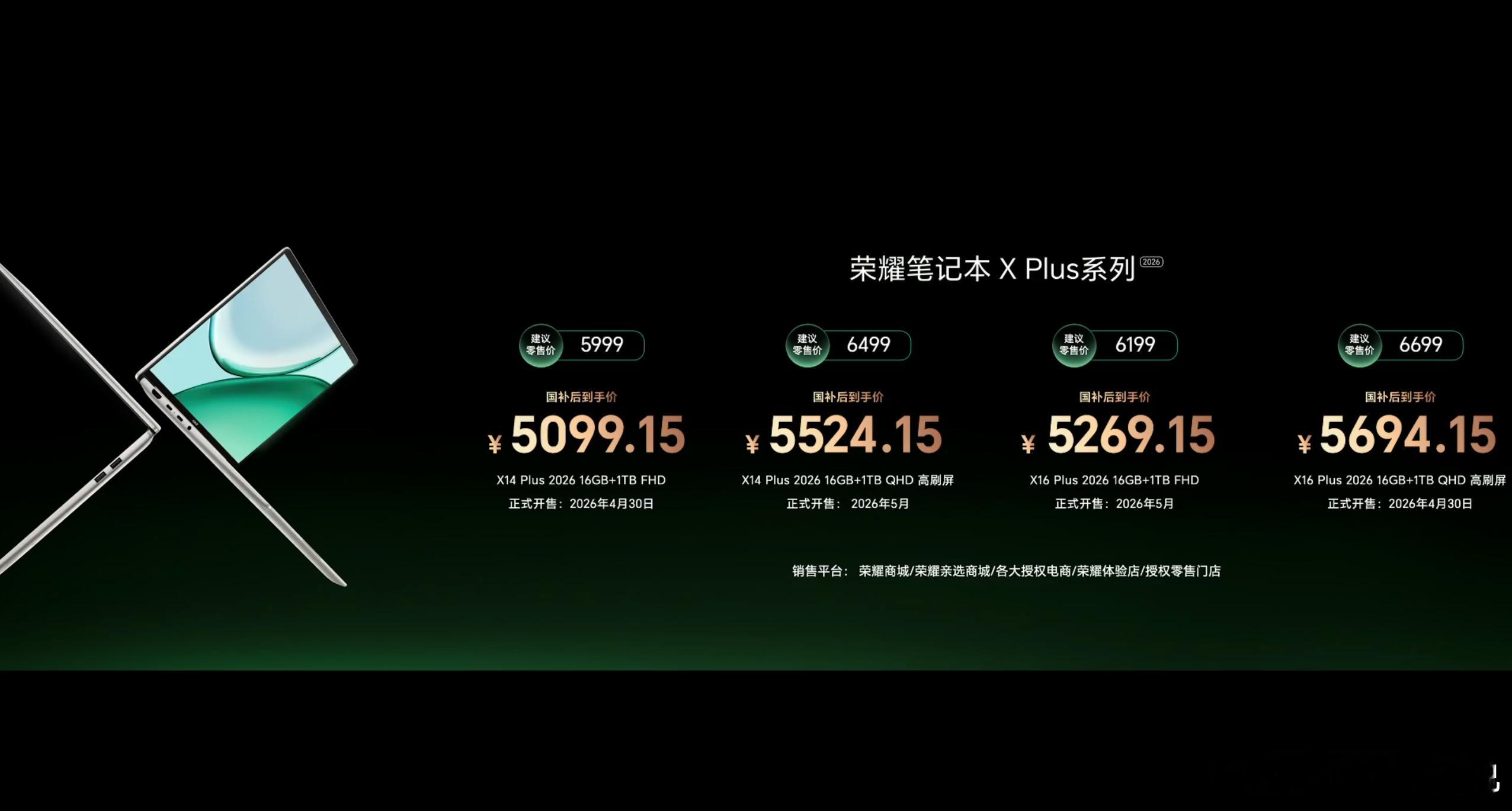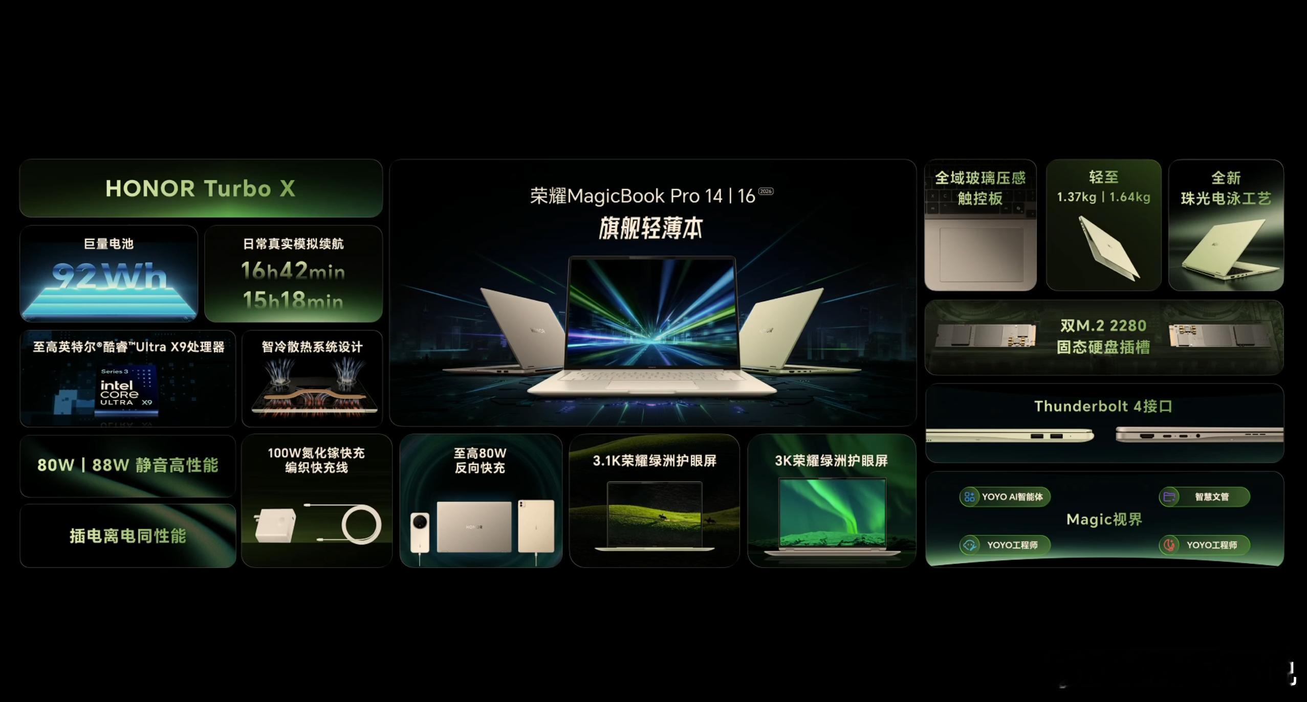 荣耀也是补齐了自家高端游戏本产品线,发布了 WIN H9 / H7 游戏本,性能释放很强,H9搭载Ultra9 290HX Plus和满血RTX5070Ti,性能释放最高有 270W,散热设计也很激进,2个离心主扇 + 4个轴流辅扇;还有300Hz旗舰级高刷护眼屏+3D游戏防眩晕荣耀MagicBook Pro系列2026正常换代,小细节也听劝改进,比如屏幕降低反光,触控板升级等;荣耀MagicPad 3 Pro 12.3,主打轻薄,4.8mm比iPad Pro 13还要薄,全球最薄,搭载骁龙8 Gen 5,可以一键切换 PC 模式;荣耀笔记本 X Plus 系列 2026,延续硬核品质,汽车压过也能正常使用价格如下,你喜欢哪一款?打洲本还得看荣耀WIN