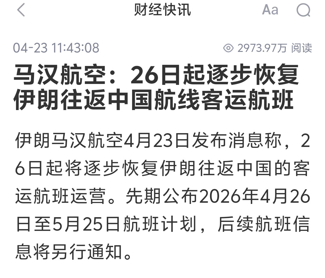 伊朗将恢复往返中国航班 伊朗马汉航空宣布将于4月26日起逐步恢复伊朗往返中国的客运航班,这是伊朗领空因中东冲突关闭50天后的首次复航。