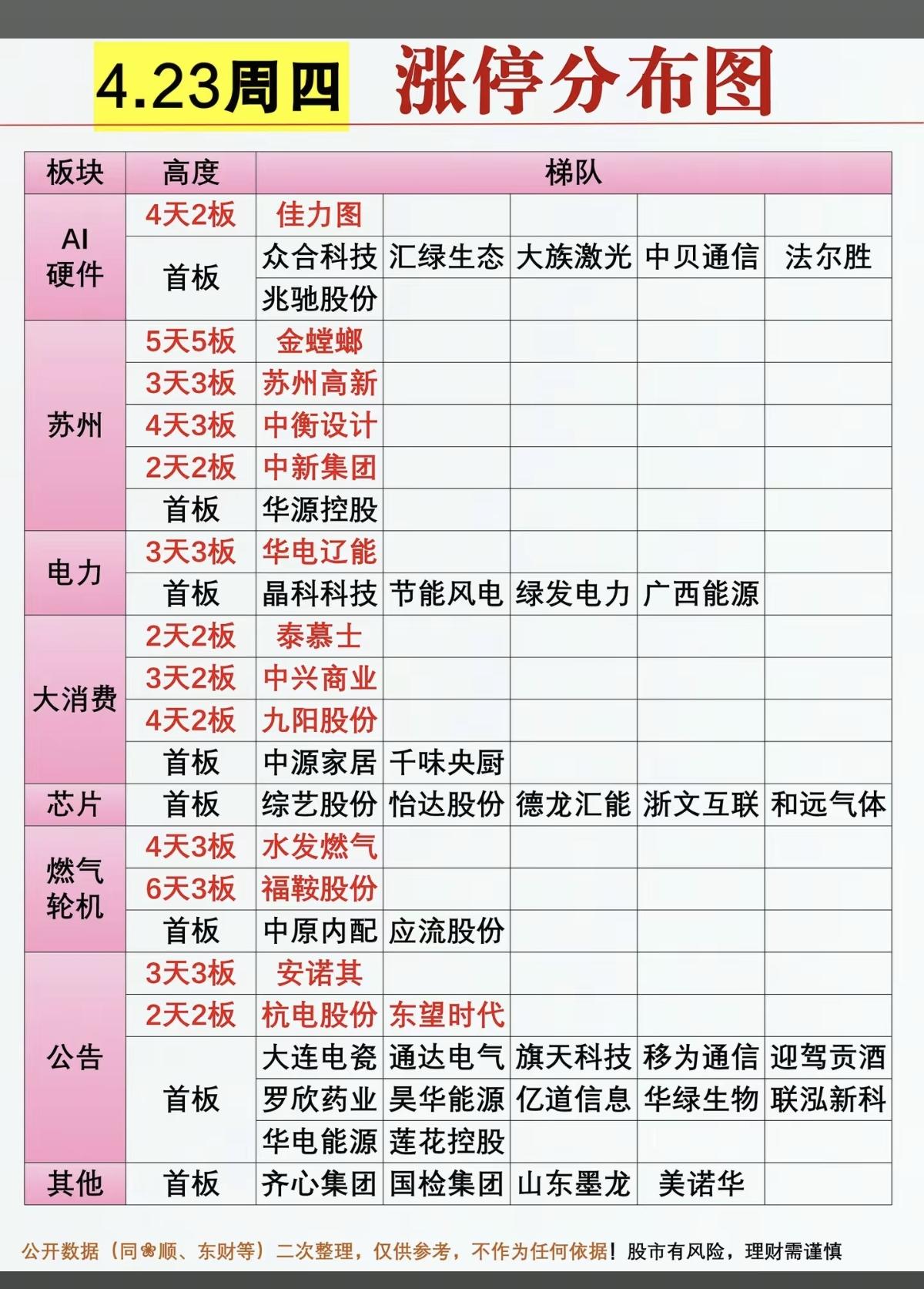 4.23周四 涨停板股票+题材+梯队高度! 1.硬件AI 7股涨停 2.苏州板块 5股涨停 3.电力电网 5股涨停 4.大消费 5股涨停 5.芯片半导体5股涨停 6.燃气轮机 5股涨停