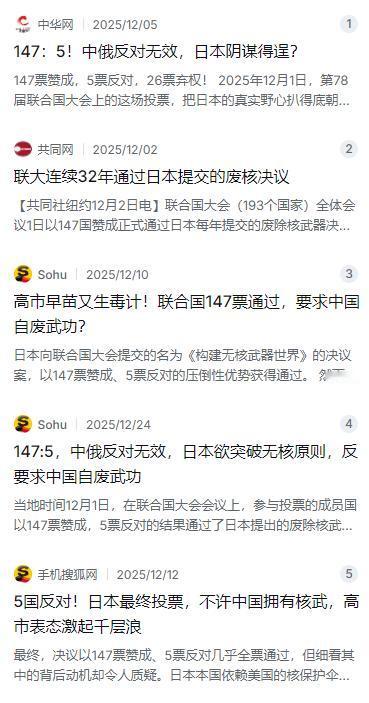 中国反对无效、美国弃权、俄罗斯也没能拦住,联合国以147票赞成的压倒性优势,通过了日本提交的"废核决议"! 麻烦看官老爷们右上角点击一下“关注”,既方便您进行讨论和分享,又能给您带来不一样的参与感,感谢您的支持! 2025年12月初,纽约联合国总部的联大会场上,一场备受瞩目的投票结果尘埃落定。日本连续第32次提交的废除核武器决议案,以压倒性优势获得通过。193个成员国中,147票赞成、5票反对、26票弃权。这是日本从1994年开始,每年例行在联大上演的“和平秀”。 与往年笼统呼吁核裁军不同,2025年的这份决议草案增加了十分具体且针对性极强的新内容——明确要求建立“中美俄三方核裁军框架”,并单独点名中国,要求中国展现所谓与核武库规模相符的透明度和责任。 日本给出的理由听起来冠冕堂皇:中国核弹头数量已位列世界第三。明眼人都能看出,这本质上是一种偷换概念的政治碰瓷。 明算一笔账就全清楚了。截至2024年的权威数据显示,俄罗斯手握约4380枚核弹头,美国约3708枚,两国合计控制着全球90%以上的核武器库存。中国长期奉行防御性核战略,核力量始终维持在国家安全所需的最低水平。 真实情况是,中国的核弹头数量尚不及美俄任何一方的零头。日本强行把一个规模远逊于美俄的中国绑在谈判桌上,要求三方对等裁军,就如同要求一个瘦弱的孩子与两位壮汉进行同等重量级的举重比赛,明显是场阴谋。 面对夹带“私货”的决议草案,中国和俄罗斯投下了反对票。与此同时,朝鲜、伊朗和尼加拉瓜也投出反对票。五国的考量各异,但都表达了对这份决议缺乏公正性的疑虑。 最引人注目的是美国的投票选择。往年美国一直是这项决议的共同提案国,而这次美国的常驻联合国代表却投了弃权票。这种态度的急转弯绝非偶然。 美国的选择背后是一场精密的算计。一份没有法律强制力的决议,根本无法约束拥有全球最大核武库的美国。然而,决议中打压中国的内容,恰好能配合美国的印太战略消耗其战略对手,堪称一本万利的买卖。 有分析人士曾用一句成语形容美国的这种“幕后纵容、前台看戏”的心态——借刀杀人。美国既想给中国制造麻烦,又不想在谈判桌旁束缚自己的手脚。 中国常驻联合国代表耿爽的解释发言一针见血。他指出,美俄拥有全球90%以上的核武器,理应率先履行削减核武库的特殊优先责任,为其他国家创造条件。在美俄大幅削减之前,强行要求中国加入所谓三边核军控谈判,既不合理也不现实。 俄罗斯代表的发言则更为犀利。俄方代表毫不客气地嘲讽日本,质问日本为何对自身庞大的核材料储备闭口不谈?为何对自己的“老大哥”美国的核扩张与核共享视而不见?这种选择性失明的表演,根本毫无公正性可言。 当日本代表团在联大会场上展示广岛长崎核爆的受害者照片,声泪俱下地谴责核武器的惨无人道时,国际媒体却悄悄挖出了另一组可怕的数据。 根据国际原子能机构2025年10月发布的最新报告,日本储存的分离钚总量已高达47.8吨,其中约10吨达到武器级标准。如果用于军事,这些材料足够制造6000枚核弹头。作为《不扩散核武器条约》成员国中唯一拥有完整核燃料后处理技术的无核国家,日本还储存着1.2吨高浓度铀。这种只进不出的囤积模式,已引发国际社会对其核野心的普遍关切。 日本政坛的动向更让外界警觉。首相高市早苗上台后,开始推动所谓修改“无核三原则”的计划,试图为美国核武器运进日本铺平道路。与此同时,日本右翼势力暗中炒作“核共享”讨论,试图为自己未来突破无核国身份增加合法性。 147比5的投票结果看似是国际社会对废核事业的压倒性支持,实则是日本打着受害者旗号进行的一场精明的政治操弄。大多数无核国家出于反对核武器的朴素道义立场投下赞成票,却未察觉日本在决议中夹带的打压中国的私货。 真正的废核事业绝非单方面针对某个特定国家的不公平博弈,而是需要美俄这两个核超级大国率先大幅削减武库,为世界的真正安全迈出实质性第一步。至于那些一边高喊废核一边囤积海量核材料的国家,他们在联合国舞台上演的这场“和平秀”,终究会被历史的流水冲走。 毕竟,谎言说一千遍还是谎言,而事实胜于一切雄辩。