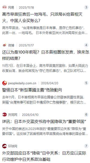 日本着急,来华被拒绝 根据日本方面透露,目前日本无论是通过官方层面还是民间层面想要和中国有更多交流,均已经被拒绝。 这也意味着,中日关系接下来将不太乐观,日本必须拿出更多实际行动来示好中国,否则中日关系将更难。 麻烦看官老爷们右上角点击一下“关注”,既方便您进行讨论和分享,又能给您带来不一样的参与感,感谢您的支持! 日本最近的日子不太好过。从官方到民间,从政界到商界,日本方面想跟中国搭上线、多交流,结果发现门推不开,消息传不过去。这到底是怎么回事?简单说就是,日本自己把路走窄了,把桥拆了,现在想回头,但中国这边已经不买账了。 事情要从2025年11月说起。日本首相高市早苗在国会众议院预算委员会上放了一通狠话,说如果中国大陆武力收复台湾,那可能对日本构成“存亡危机事态”。这话听着是不是有点耳熟?没错,就是照搬了美国政客那套“台湾有事就是日本有事”的说辞。但高市比美国政客走得更远——她把这话跟日本要动用集体自卫权绑在一起。要知道,一旦被认定为“存亡危机事态”,日本就可以出兵介入台海了。这不是什么外交辞令,这是赤裸裸的武力威胁。 中国方面的反应可想而知。外交部第一时间提出严正交涉和强烈抗议,要求日方立即收回错误言论。但日本呢?嘴上说“立场未变”,实际上一点退让的意思都没有。 到了2026年4月10日,日本外相茂木敏充在内阁会议上提交了新版《外交蓝皮书》。翻开一看,好家伙,关于中国的表述从“最重要双边关系”直接降成了“重要邻国”。什么叫“重要邻国”?就是比“最重要”低了一个档次,基本等于把中日关系的分量砍了一大截。蓝皮书里还反过来指责中国,说什么中方对日本加强了“单方面指责和胁迫性举措”,还举了中国军机照射雷达、两用物项出口管制这些例子。说白了,日本就是在倒打一耙。 外交部的回应也很快。发言人毛宁直接点出,中日关系搞成现在这样,根源就在于日本首相的涉台谬论,这是背信弃义,损害了中日关系的政治基础,还挑战了战后国际秩序。话说到这个份上,已经相当重了。 日本方面当然也意识到事情闹大了。2025年11月17日,日本外务省亚洲大洋洲局局长金井正彰紧急飞到北京,想跟中方沟通,把这事平息下去。第二天,他跟外交部亚洲司司长刘劲松见了面。据日媒分析,金井大概是想说明高市的发言并没有改变日本在1972年《日中联合声明》中的一贯立场,但日方可能不会同意撤回高市的那番话。 结果怎么样呢?14点左右,金井正彰一行离开中国外交部,面对媒体的提问,他一个字都没说,一言不发地走了。这种沉默本身就是最好的答案——谈不拢。 更让日本方面头疼的是,原本想在2025年11月底的G20峰会期间安排高市与中国国务院总理李强会面,但中方在会前就直接明确表示:没有这个安排。连见面的机会都没给。 如果说政治层面的僵局还能用“立场不同”来解释,那日本经济界的遭遇就更能说明问题了。日本经济界现在是真的急了。一方面,中国市场对日本企业的重要性不言而喻;另一方面,高市政府在安全和外交上不断搞事情,把中日关系越搞越僵。企业家的算盘是赚钱,政客的算盘是搞军事、搞同盟,这两拨人根本不在一个频道上。 于是就有了这么一幕:今年早些时候,日本三大经贸团体的访华申请被中方“冷处理”,无限期推迟。这在日本经济界引起了不小的震动。以前每年雷打不动的访问,现在说没就没了。 但这还不是最尴尬的。日本国际贸易促进协会会长河野洋平,这位89岁的日本政坛“知华派”元老,计划在2026年6月21日至24日率领一个约80人的代表团访问北京。代表团里有各大财团的高管,有中日贸易的资深顾问,阵容相当豪华。他们提前好几个月就开始跟中方协调,还主动提出希望能跟中方高层见面。在日方看来,有河野洋平这块“金字招牌”坐镇,邀请函应该是板上钉钉的事。毕竟过去几十年,他每年都率团访华,每次都是高规格接待。 但这次不一样了。距离预定的访华日期越来越近,中方的邀请函却始终杳无音讯。别说高层会面了,能不能入境都还是未知数。河野洋平这块招牌,这次好像不管用了。 更扎心的是,前不久的博鳌亚洲论坛,日本方面连一张邀请函都没收到。据《共同社》报道,日本外务省对此感到“极度困惑”,甚至多次通过私下渠道询问原因。但中方的态度非常明确:既然日方没有表现出足够的诚意,这种高级别的对话也就没有必要了。
