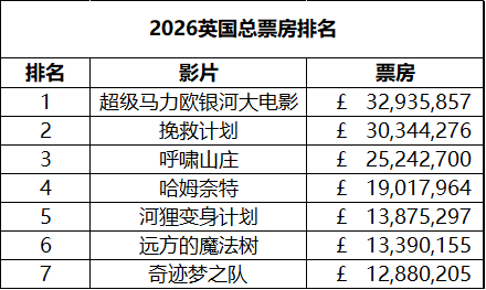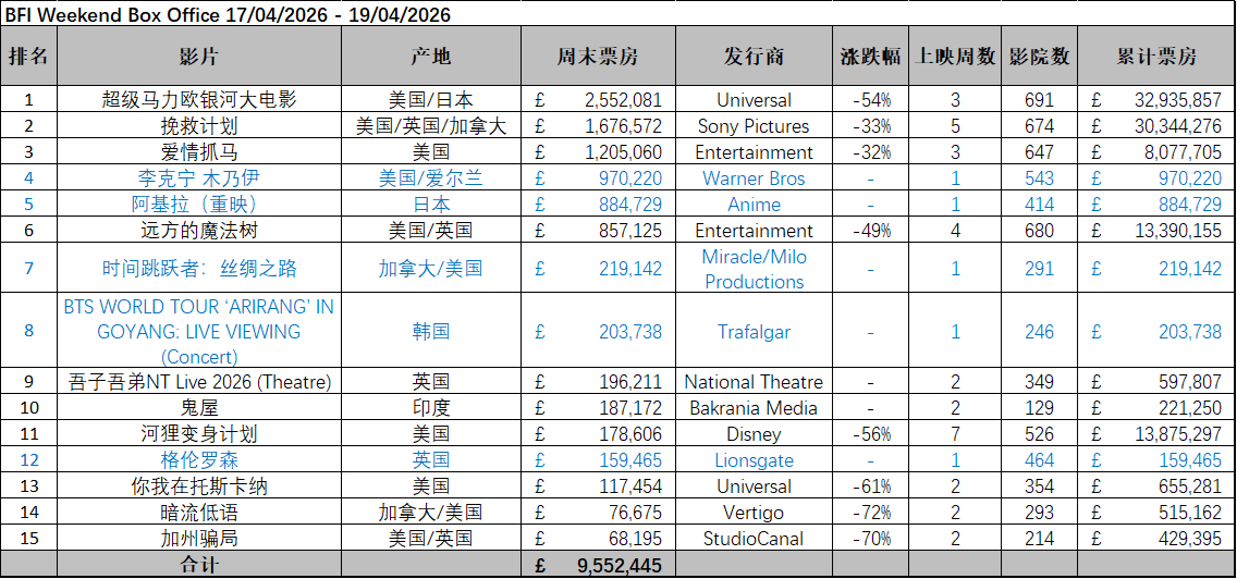 英国周末票房(4.17-4.19):1.《超级马力欧银河大电影》三连冠,累计票房3293万英镑;2.《挽救计划》累计票房突破3000万英镑;3.《李克宁 木乃伊》在新片中表现最佳。(数据:BFI)