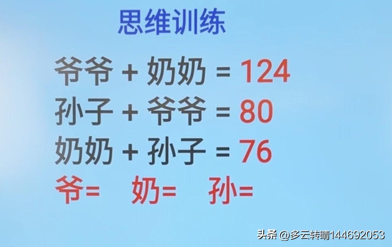 这类题目画图计算更一目了然,当然也能直接推理:由1式和2式推出奶奶比孙子大44岁,由2式和3式又能推出爷爷比奶奶大4岁,再代回1式可知: 爷爷64岁, 奶奶60岁, 孙子16岁。 我看到这类题目就忍不住提笔画图,都很快能算出来。