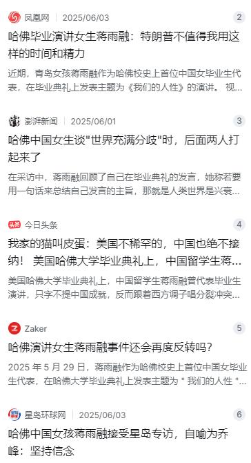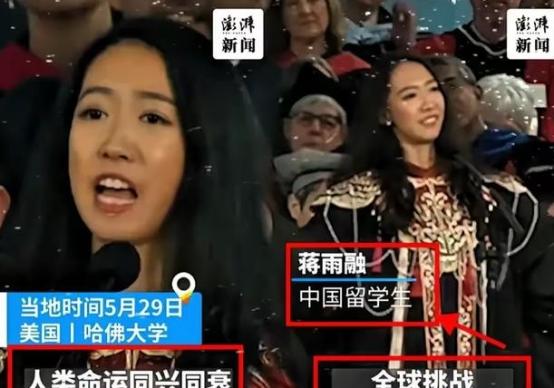 美国不要的,中国也坚决不要!美国哈佛大学毕业典礼上,中国留学生蒋雨融曾代表毕业生演讲,只字不提中国成就,反而跟着西方调子唱分裂冲突? 麻烦看官老爷们右上角点击一下“关注”,既方便您进行讨论和分享,又能给您带来不一样的参与感,感谢您的支持! 2025年5月底,美国哈佛大学的毕业典礼上演了一出让人心里堵得慌的戏。台上的主角是一个中国姑娘,叫蒋雨融,山东青岛人,哈佛肯尼迪学院读公共行政硕士。她是哈佛近四百年来第一个站上毕业典礼演讲台的中国女生,这个机会有多难得,不用多说。可她说的话,做的事,让国内很多人看完直接炸了。 这场毕业典礼本身就很不寻常。就在典礼前几天,特朗普政府刚刚宣布要冻结哈佛22亿美元的长期拨款,还扣下6000万美元的合同款。更狠的是,美国国土安全部直接取消了哈佛招收国际学生的资格,虽然没有马上执行,但刀子已经架在脖子上了。同时,美国政府还宣布大规模吊销部分中国留学生的签证,尤其针对学半导体、人工智能、航空航天这些关键领域的学生,涉及近三万人。说白了,就是明摆着要把中国学生往外赶。 在这种气氛下,哈佛校长艾伦·加伯上台致辞,第一句话就特意强调欢迎“来自世界各地的学生”,语气很重,摆明了是在跟政府对杠。教授和毕业生们胸前贴着“没有国际学生的哈佛不是哈佛”的贴纸,气氛又紧张又悲壮。这时候,大家的目光自然就落到了即将上台演讲的蒋雨融身上——一个中国学生,一个代表毕业生发言的人,在这个节骨眼上,她会说什么? 结果让所有人都失望了。 蒋雨融穿着学位服,肩上披着一件中国传统的云肩,光看打扮还挺有中国味道。可她一开口,从头到尾半个字都没提中国。没提中国取得的成就,没提中国的发展,没提中国的脱贫攻坚、一带一路、全球发展倡议,也没提任何一件中国做得漂亮的事。她讲的是“守护我们的人性”,讲分裂、冲突、恐惧,讲人与人之间要放下敌意、不带评判地倾听。 这些话单独拎出来看,没毛病,甚至还挺高尚。可问题是,你放在那个时间、那个地点、那个背景下说,味道就完全变了。美国正在明目张胆地打压中国留学生,正在用签证和资金掐你脖子,你的校长都在台上帮国际学生说话,而你作为一个中国代表,竟然一句硬话都不敢说,连一声“中国”都不敢提。这不是高尚,这是怂。 更让人来气的是,她不仅没提中国,反而跟着西方那套“分裂、冲突、人性”的调子走。西方媒体最常干的事是什么?就是渲染中国和世界的“价值观冲突”,把中国描绘成一个异类,一个不遵守所谓“普世规则”的国家。蒋雨融的演讲恰好迎合了这种论调——她大谈特谈分歧,却从来不点明这些分歧是谁制造出来的;她讲排外和恐惧的危害,却一字不提这些排外政策的源头就是特朗普政府。她把问题抽象成“人性”,好像所有的错都是人类自己的毛病,跟具体的国家、具体的政策没关系。 这种话术,说白了就是西方精英最喜欢的那套“政治正确”模板。听起来很动听,实际上什么实质内容都没有,更不会得罪任何人。但问题是,作为一个中国留学生,你在这个讲台上选择说这种话,就等于主动放弃了为中国发声的机会,等于默认了西方那套“中国不关心人性、只关心利益”的叙事。 国内网友的愤怒是有道理的。有人说她这是“精致的利己主义”,算盘打得叮当响。你看,她在台上不谈任何敏感话题,不说中国好,也不说美国坏,两边都不得罪,回国能被夸“国际化”,留美能被夸“理性包容”。多完美的人设啊。可她唯独忘了自己是谁,从哪里来。她把个人的安全和人设维护看得比什么都重要,却忘了在这个讲台上,她代表的不仅仅是她自己。 还有人说得更直接:美国不要的,中国也坚决不要。什么意思?美国现在疯狂打压中国留学生,恨不得把这群人全赶走,而蒋雨融在台上不仅不反击,还跟着美国的调子唱分裂,这种人在美国可能被当成“听话的模范少数族裔”,但在中国,没人吃这一套。你有机会为祖国说话你不说,你有机会揭露不公你不揭,你穿个汉服就完了?汉服是形式,内容才是灵魂。 蒋雨融后来的辩解更是让人无语。她说自己的演讲稿从3月就开始准备了,觉得特朗普政府的事“太小了”,不值得用这么重要的舞台去直接对话。听听这话,三万中国留学生的签证被吊销,哈佛被冻结几十亿拨款,这叫“太小了”?在她眼里什么才叫大?大概只有她那些关于“人性”的空洞口号才算大吧。这种脱离现实、高高在上的姿态,恰恰暴露了她跟普通留学生之间的巨大鸿沟。