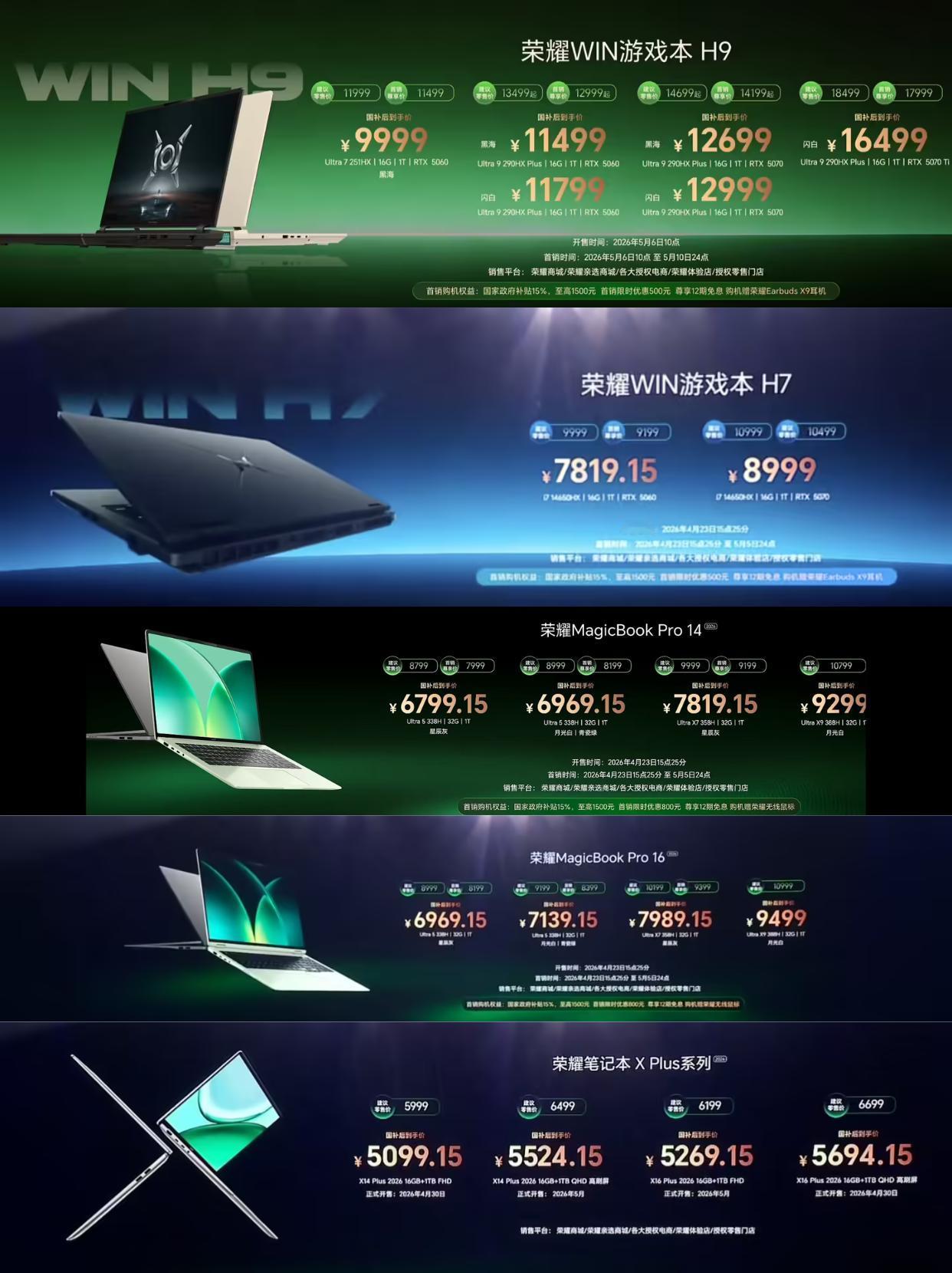 荣耀今天一口气发了好几款笔记本,简单过一下 先说游戏本,新出的WIN H9,建议零售价11999元起,国补后9999元就。还有一款WIN H7,首发价9199元,国补后7819元,配置是i7加RTX 5060。 轻薄本这边,MagicBook Pro 14和16都更新了,国补后价格基本在7000到8000元档。最便宜的X14 Plus,国补后5099元就能买到。对于学生党或者办公族来说,这个价位还挺香的。你们觉得这个价格怎么样? 数码大玩家 一起聊数码 荣耀笔记本 轻薄本 科技资讯早知道 数码资讯