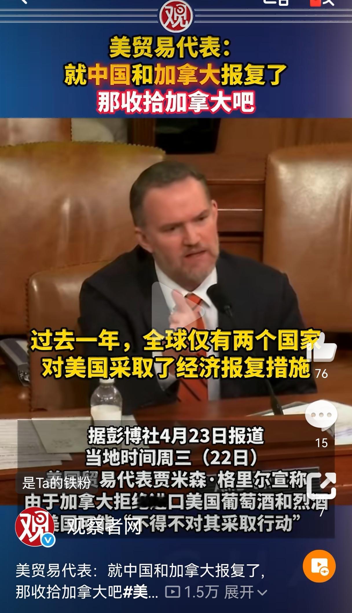 当地时间2026年4月22日,美国贸易代表贾米森·格里尔在众议院筹款委员会听证会上,回应议员质询时称:过去一年,全球仅有两个国家对美国采取了经济报复措施:中国和加拿大。我认为,我们可能需要采取强制措施,来处理加拿大在葡萄酒和烈酒方面的这一问题。相信卡尼今天看到贾米森这段话时表示很伤心,但我们都给卡尼把场子扎起来。卡尼,你别怕,社会总是会特别奖励勇敢吃螃蟹的人。只有勇于尝试,才能拿到最丰厚的回报。你看看伊朗,人家打了就打了,直接就把“美军强大”和“美式无武器先进”的神话打破了,现在白宫和五角大楼正在发愁怎么找回场子呢。现在贾米森说这段话,只不过是想转移大家视线,不要过分关注霍尔木兹海峡而已。