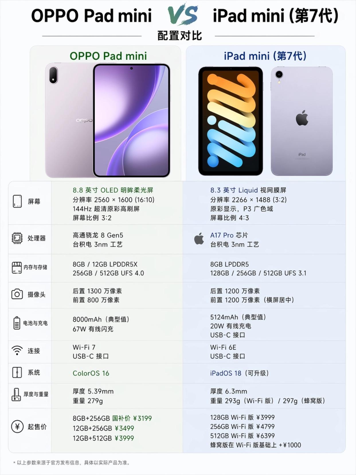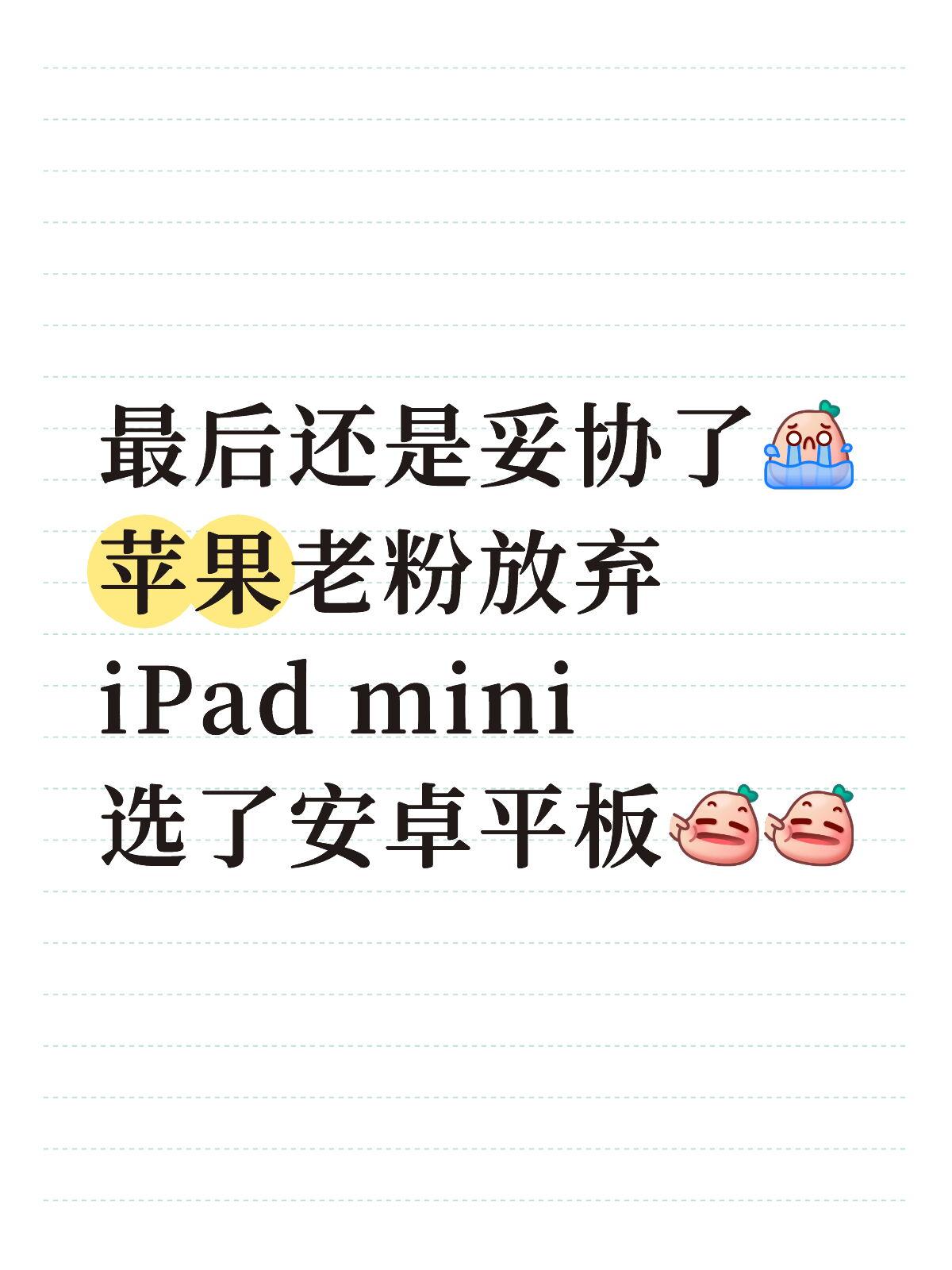 苹果老粉放弃iPad mini选了安卓平板 本身是重度苹果用户,想买个小平板专门用来看书看文献和打游戏,去店里摸了几次iPad mini,那个边框宽度确实让我有点下不去手,然后在它和安卓小平板OPPO Pad mini之间纠结了很久。 做足功课后最后入了OPPO Pad Mini,因为感觉更符合我的需求和使用习惯,首先是屏幕,OPPO Pad mini的3:2的屏幕比例和窄边框,看PDF文档比iPad mini显示面积更大更完整,看论文和杂志不用两根手指频繁去放大缩小,眼睛看起来也更舒服。 279g的机身比iPad mini还要轻一点,尺寸都很小,单手握持看一小时书手也不酸,晚上躺被窝里举着看,完全不担心手滑砸脸,而且OPPO Pad mini还有淡彩类纸模式 看彩色漫画既能保留色彩,又有纸质书的质感 iPad mini没有这种专门的护眼阅读模式 晚上关灯看书的话,舒适度差距还是挺明显的 没有说苹果不好的意思,iOS生态依然很稳,跟我的手机、耳机肯定更搭,但OPPO Pad Mini在阅读体验和性价比上更符合我的需求,最终选择了这个。